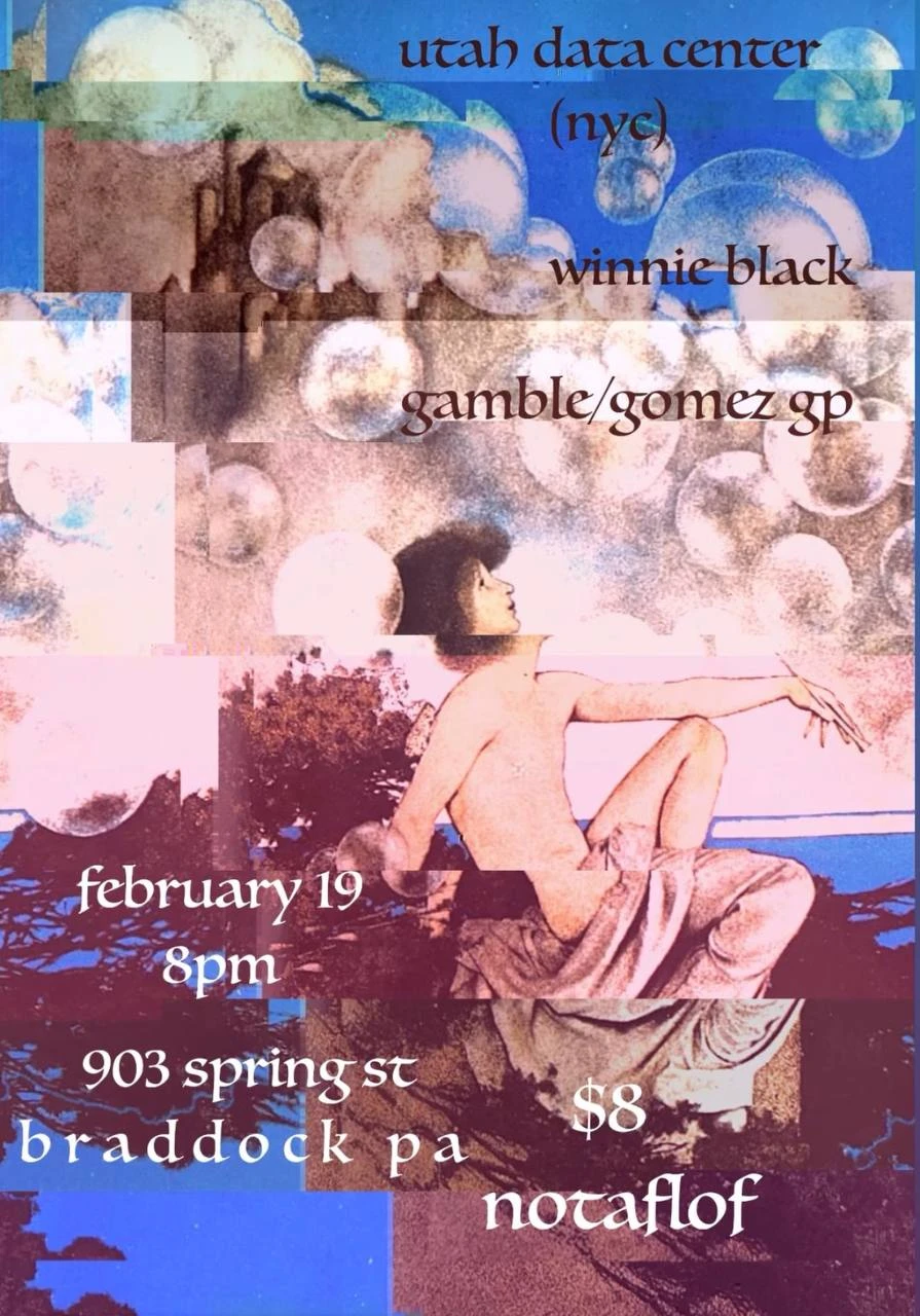Utah Data Center (NYC) with Winnie Black and Gamble/Gomez GP Utah Data Center (NYC), Winnie Black, and Gamble/Gomez GP live in Braddock. Concert Thursday, February 19, 2026 at 8:00 PM 903 Spring St All Ages $8 903 Spring St Electronic Experimental