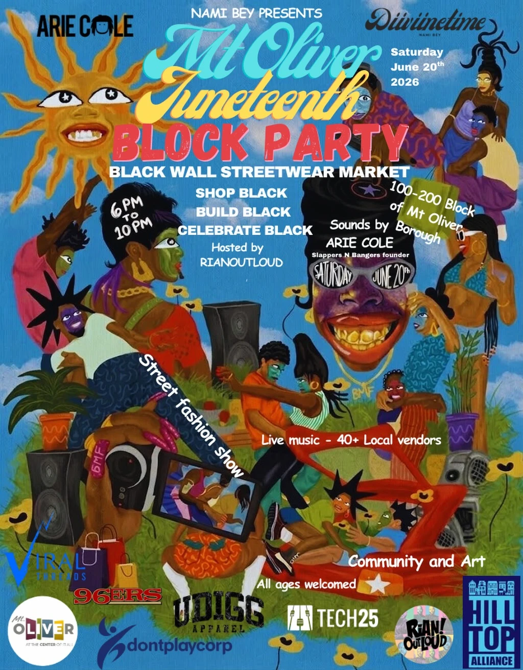 A Juneteenth celebration block party in Mt. Oliver featuring live music, a Black Wall Streetwear Market, street fashion show, and 40+ local vendors.
