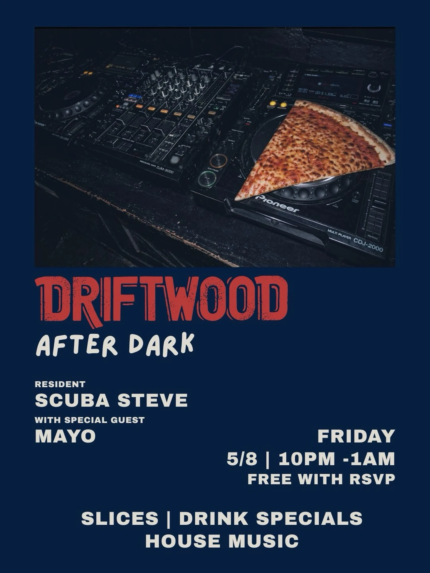 House music night at Driftwood featuring resident DJ Scuba Steve and special guest Mayo, with pizza slices and drink specials.