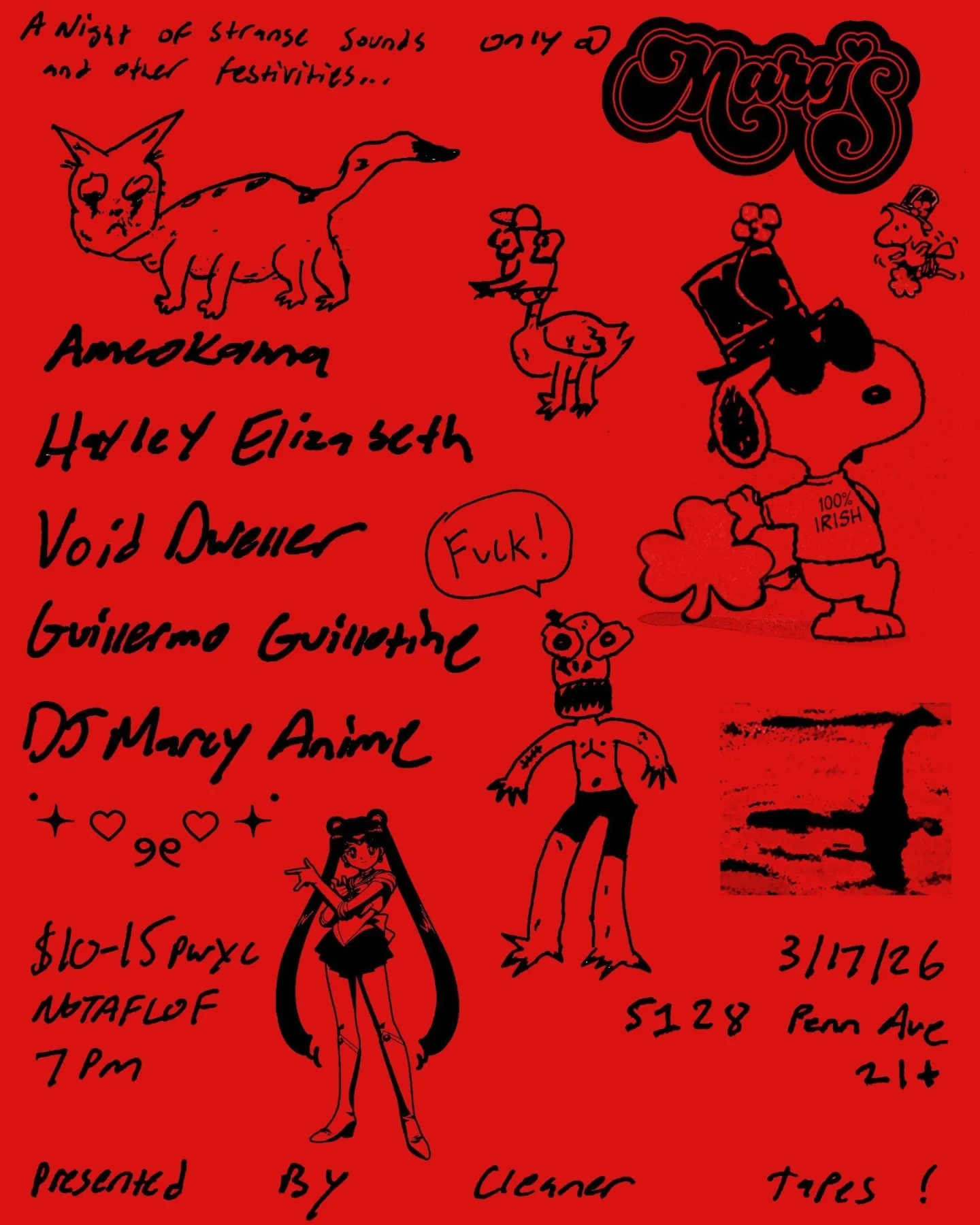A Night of Strange Sounds at Mary's Eclectic electronic, techno, screamo, industrial, and DJ sets at Mary's. Concert Tuesday, March 17, 2026 at 7:00 PM Mary's 21+ Presale: $10 Door: $15 Mary's Cleaner Tapes Ameokama +4 more Electronic Experimental Metal Noise Emo +1 more