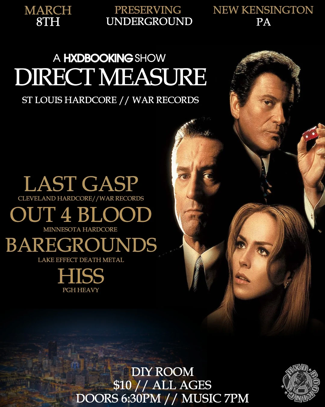Hardcore and metalcore show featuring Last Gasp, Direct Measure, Spit Extinction, Baregrounds, and Hiss.
