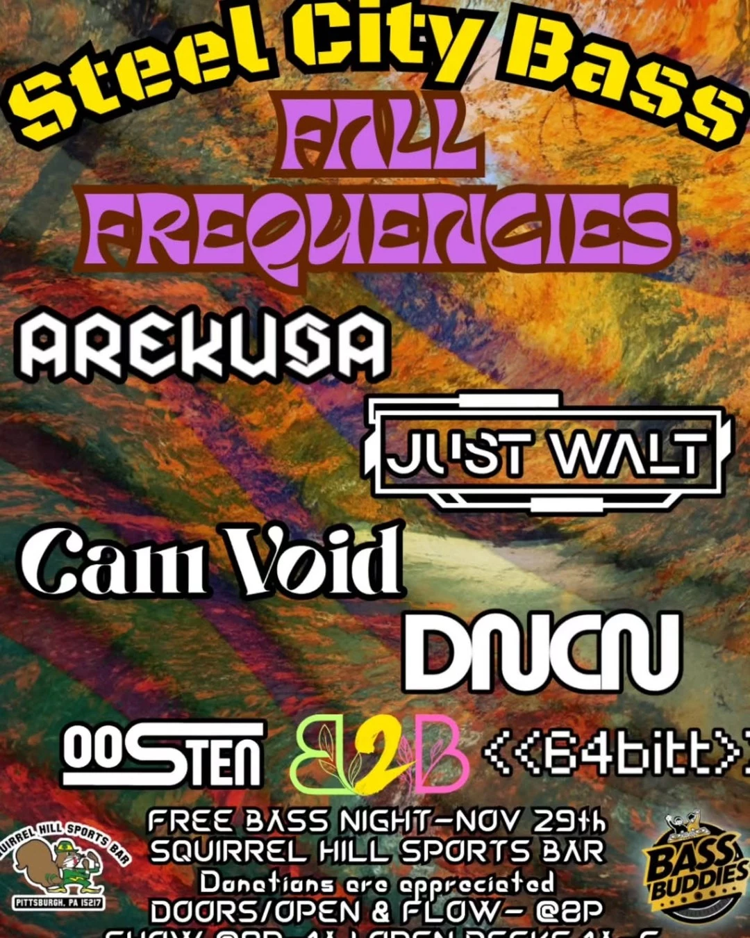 Free bass night at Squirrel Hill Sports Bar with DJs Arekusa, Just Walt, Cam Void & more Club Night at Squirrel Hill Sports Bar 21+ $0Squirrel Hill Sports Bar Steel City Bass Arekusa Void Bass Dubstep