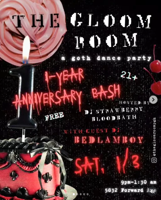 Strawberry Bloodbath is a Pittsburgh-based DJ, event host, and personality known for her vintage flair and love of spooky aesthetics. She is the host of The Gloom Room and active in the alternative nightlife scene.