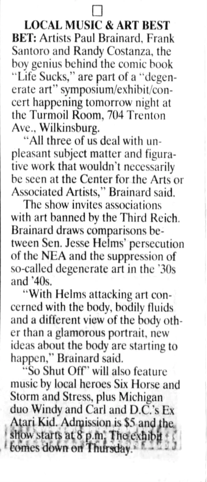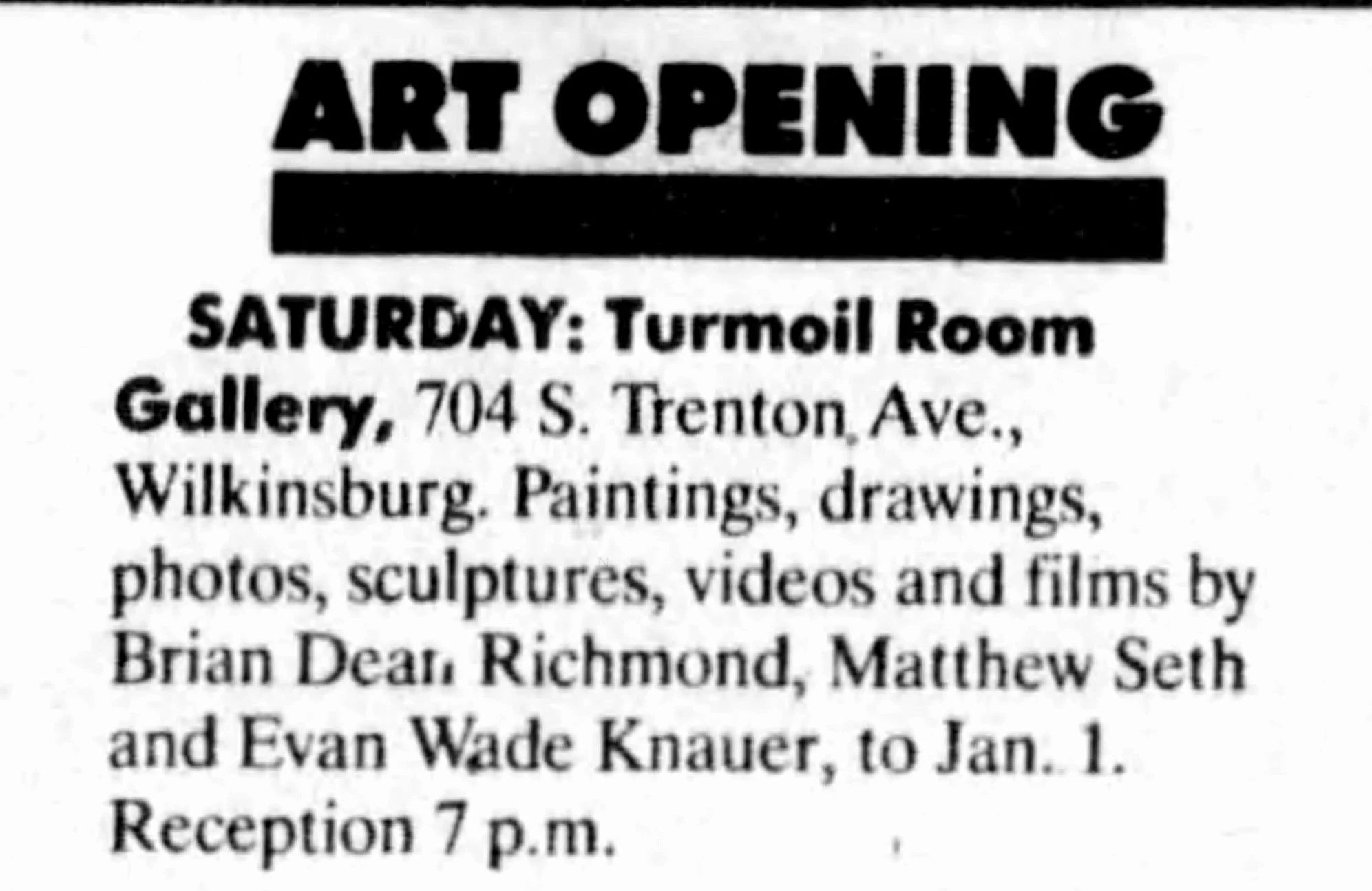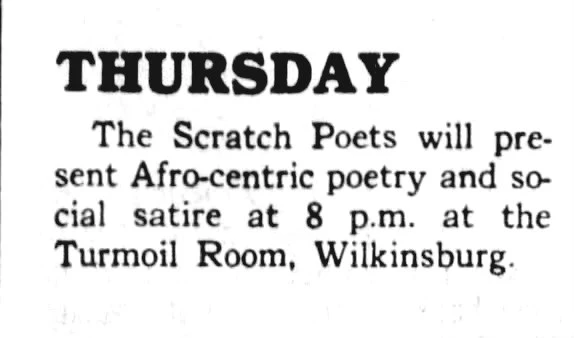 Turmoil Room 704 S. Trenton Ave. Wilkinsburg Proprietors: Willhelm Hartman, Kelton Fleming
