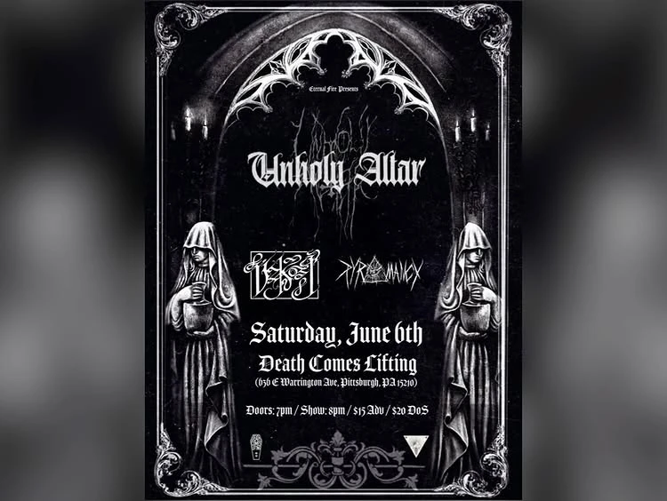 Unholy Altar makes their first Pittsburgh appearance with a special intimate performance at Death Comes Lifting's DIY space. Joining them are Úzkost and Pyromancy to round out a heavy and atmospheric black metal lineup. Doors at 7:00 PM, music at 8:00 PM. Advance tickets $15, $20 at the door.