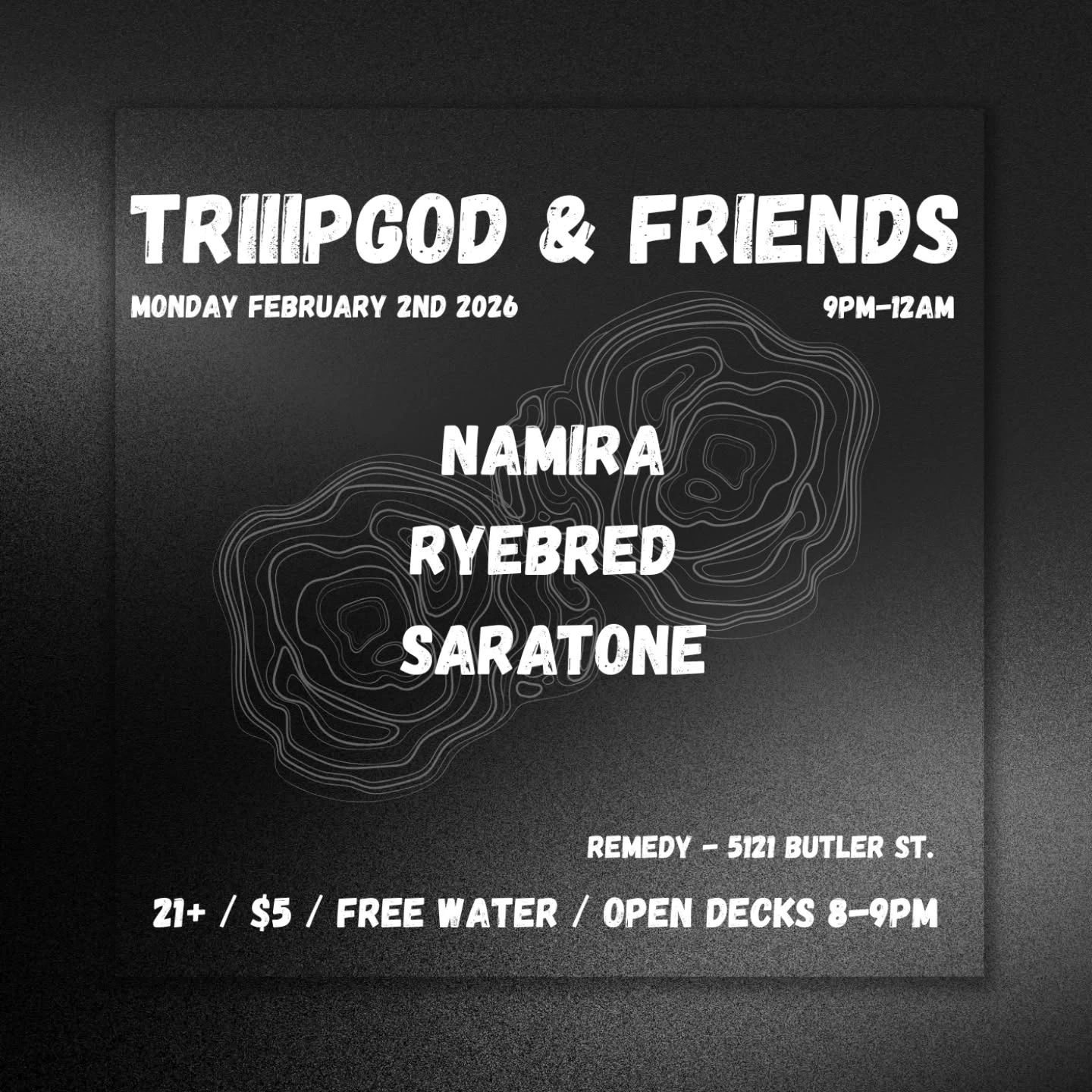 9:00 PM - 12:00 AMTriiipGod & Friends: Namira / Ryebred / Saratone