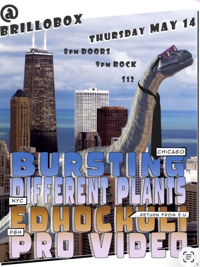 Bursting is a Chicago-based rock/punk band. Different Plants is a New York City indie/rock project. Ed Hochuli is a Pittsburgh punk/rock band returning from a European Union tour. Pro Video is a Pittsburgh-based rock act.