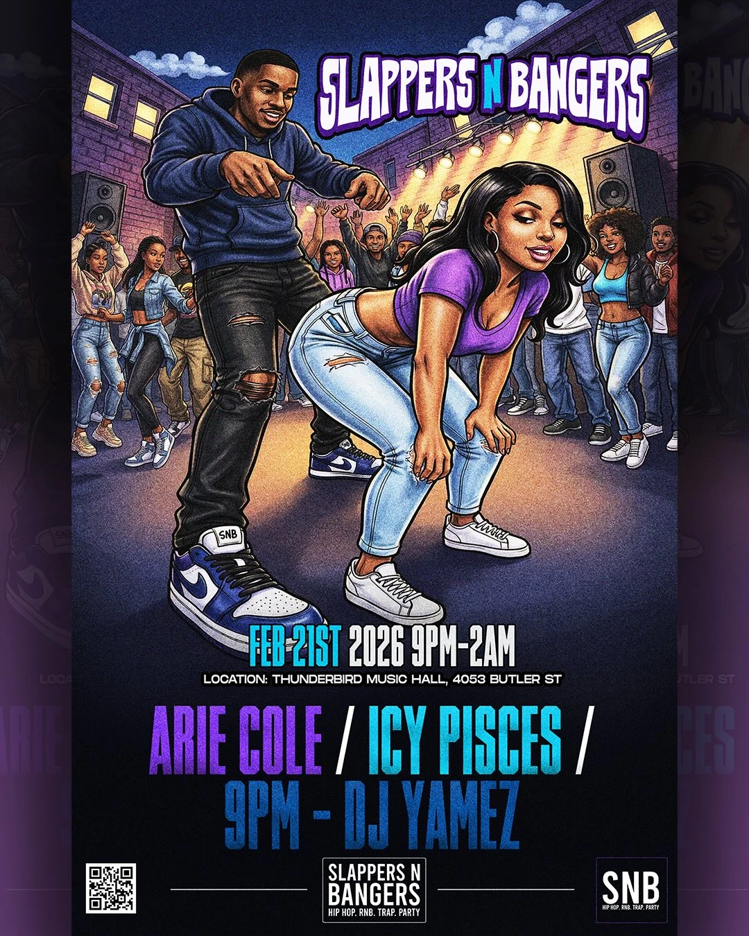 Slappers N Bangers Hip hop, R&B, and trap party at Thunderbird Music Hall. Club Night Saturday, February 21, 2026 at 9:00 PM - 2:00 AM Thunderbird 21+ Arie Cole Icy Pisces Thunderbird +1 more Hip Hop R&b