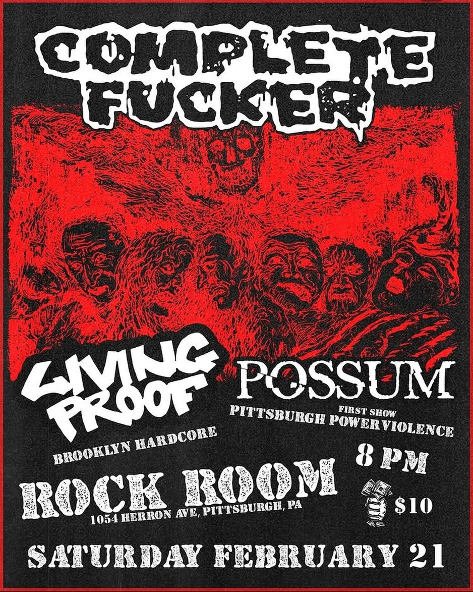 Complete Fucker + Living Proof + Possum Hardcore punk show featuring Complete Fucker, Living Proof, and Possum. Concert Saturday, February 21, 2026 at 8:00 PM Rock Room 21+ $10 Complete Fucker Possum Rock Room Hardcore Punk Thrash