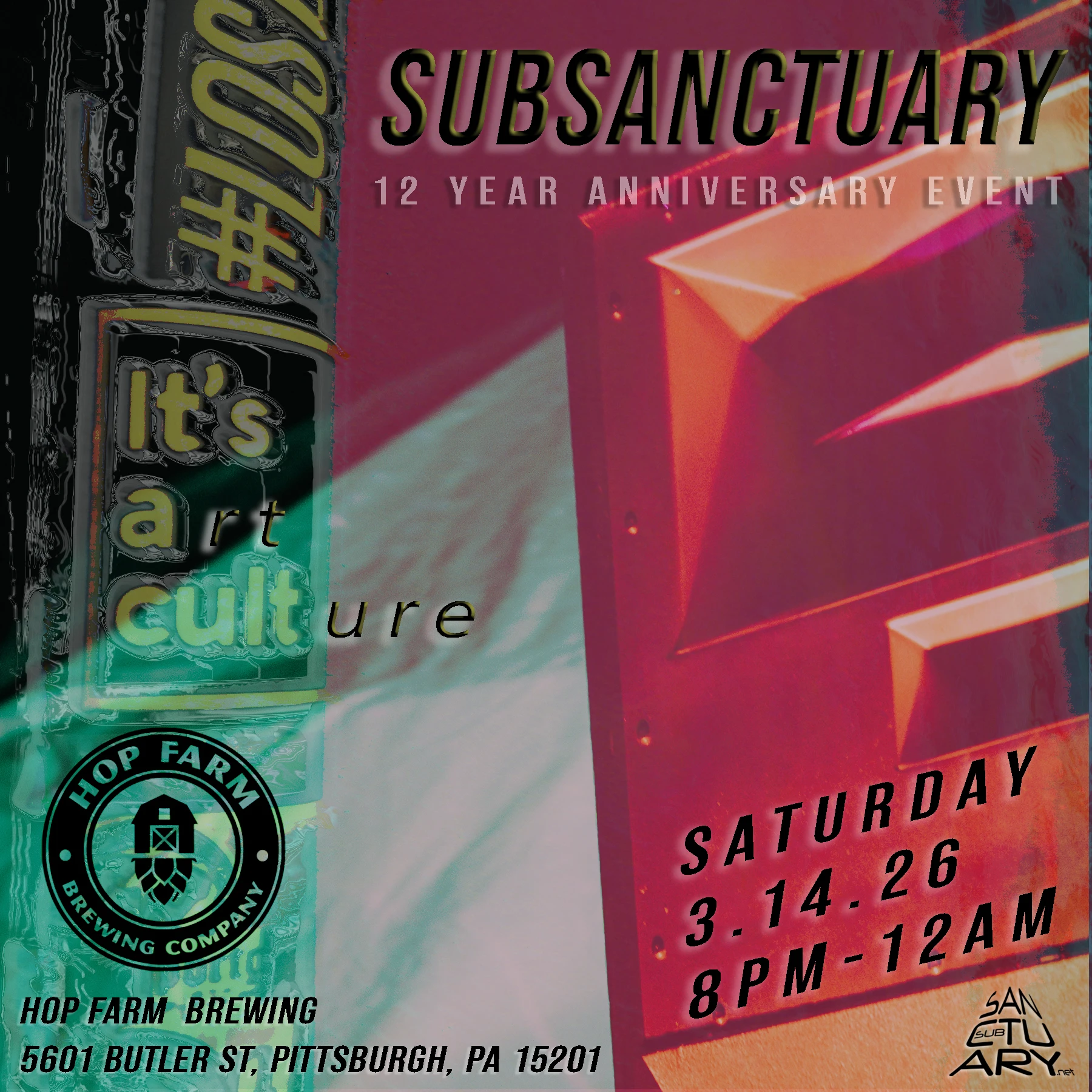 SubSanctuary 12 Year Anniversary SubSanctuary celebrates 12 years of art, sound, and community at Hop Farm Brewing. Club Night Saturday, March 14, 2026 at 8:00 PM - 12:00 AM Hop Farm Brewing Company 21+ Door: $10 / $15 Hop Farm Brewing Company SubSanctuary JTS Bass Drum And Bass Dub