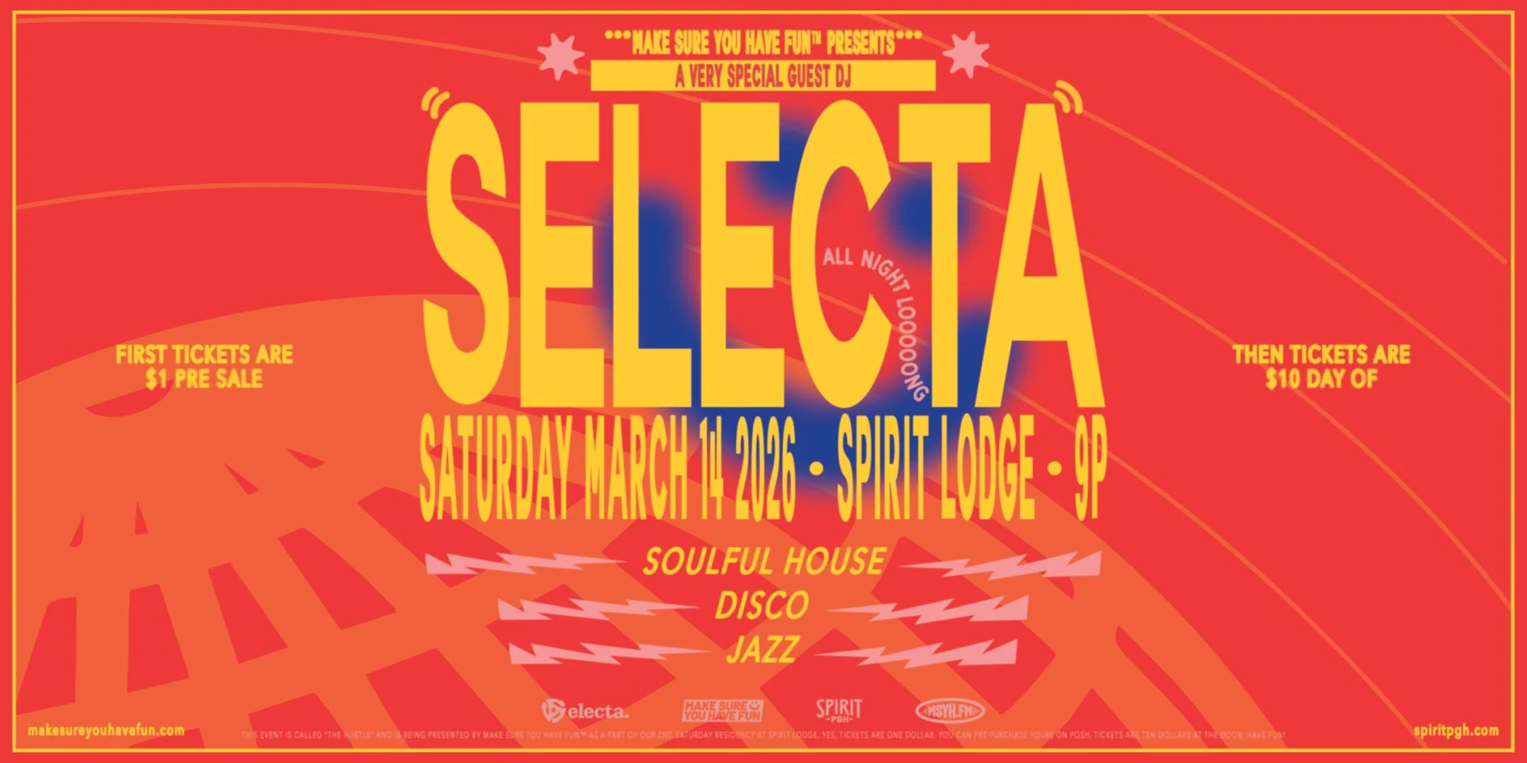 The Hustle: Soulful House, Disco and Jazz Party with Selecta The Hustle dance party ft. Selecta at Spirit Club Night Saturday, March 14, 2026 at 9:00 PM Spirit 21+ Door: $1 / $10 Spirit Selecta Deep House Jazz Soul Disco