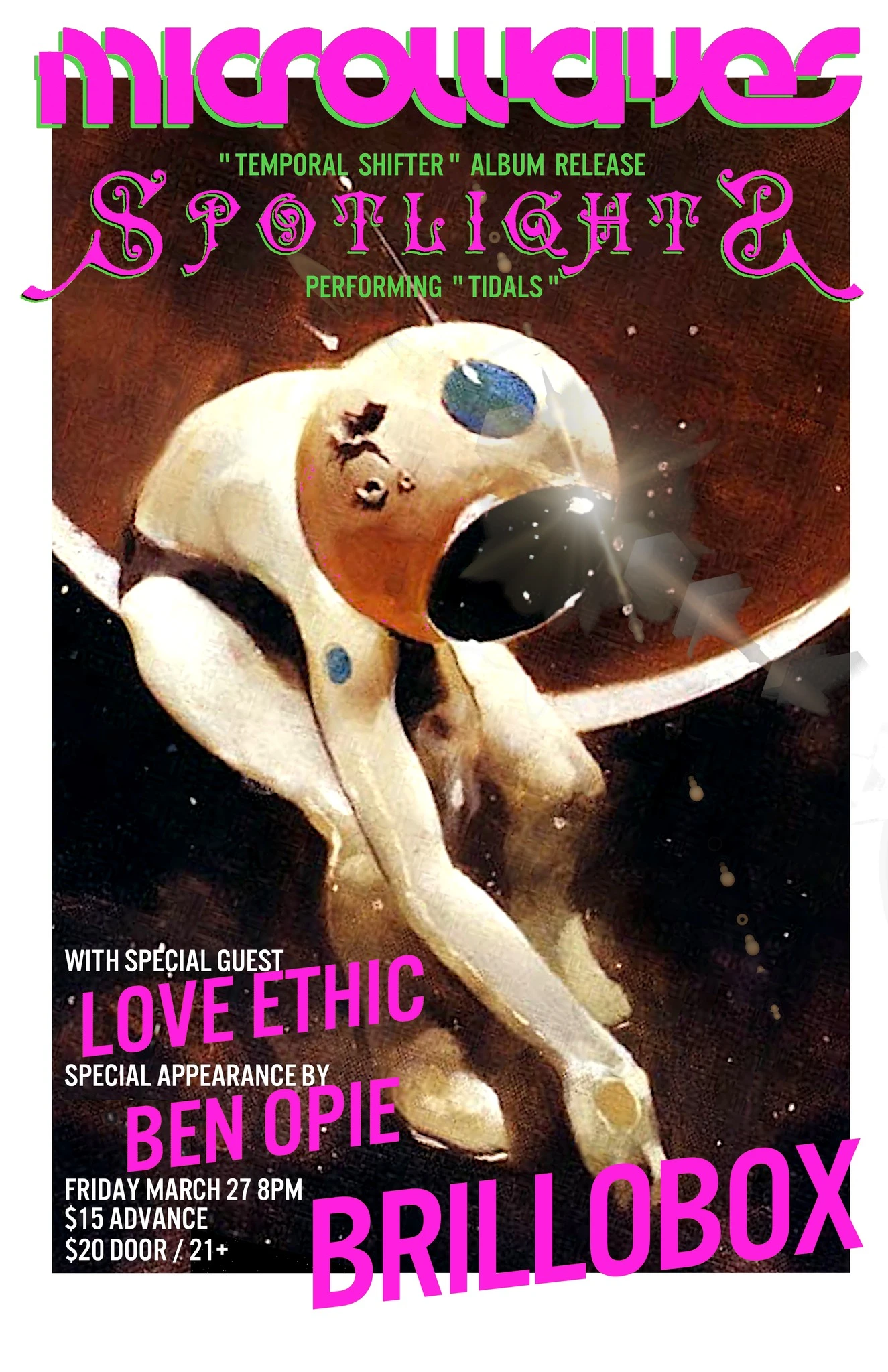 Microwaves "Temporal Shifter" Release w/ Spotlights, Love Ethic Microwaves album release show celebrating Temporal Shifter with Spotlights performing Tidals, plus Love Ethic. Concert Friday, March 27, 2026 at 8:00 PM Brillobox 21+ Door: $15 / $20 Ben Opie Brillobox Microwaves Indie Noise Rock