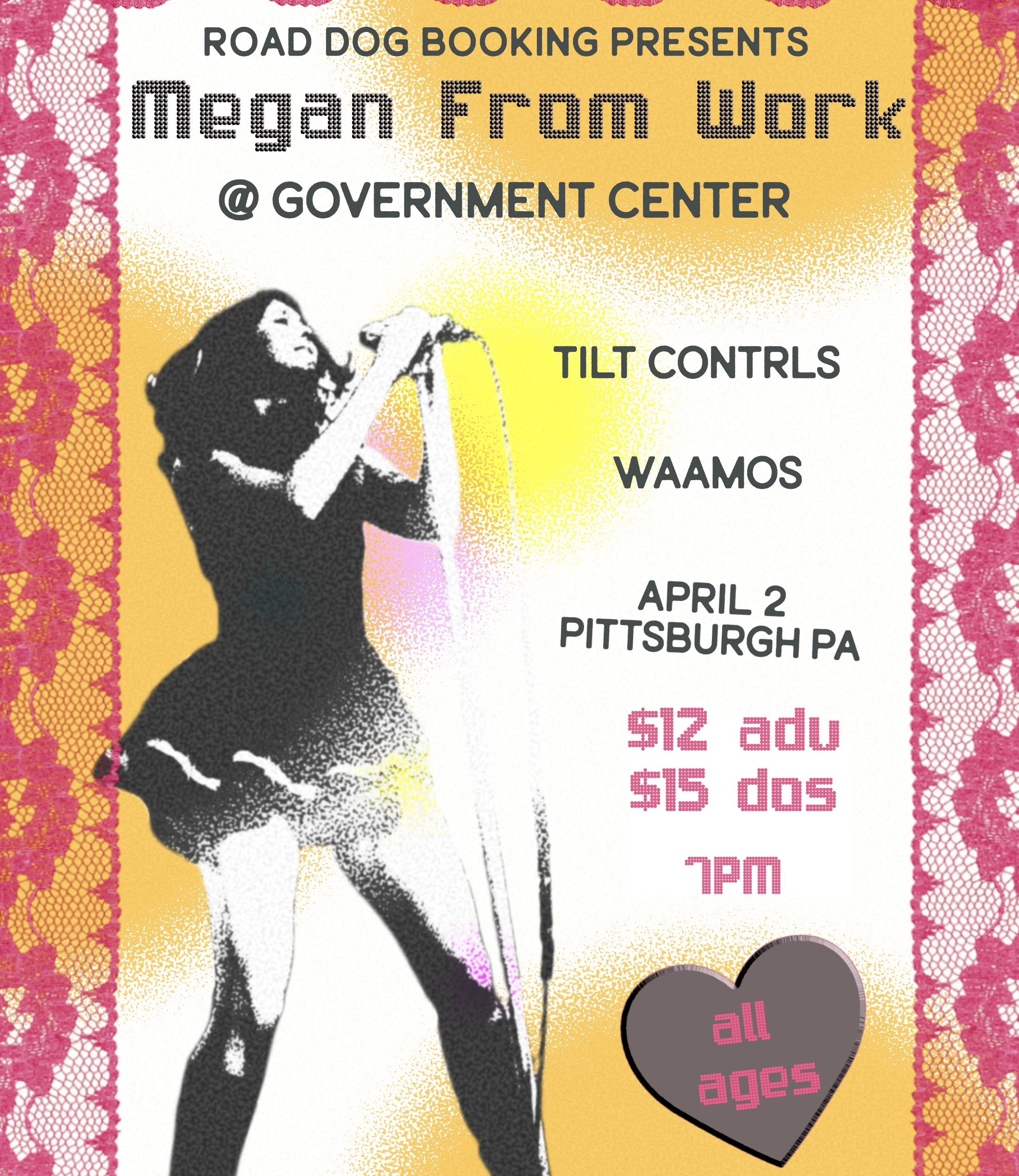 Megan From Work with Tilt Controls and Waamos Poppy punk rockers Megan From Work with Tilt Controls and Waamos at The Government Center. Concert Thursday, April 2, 2026 at 7:00 PM The Government Center All Ages The Government Center Megan From Work Tilt Controls +1 more Indie Rock