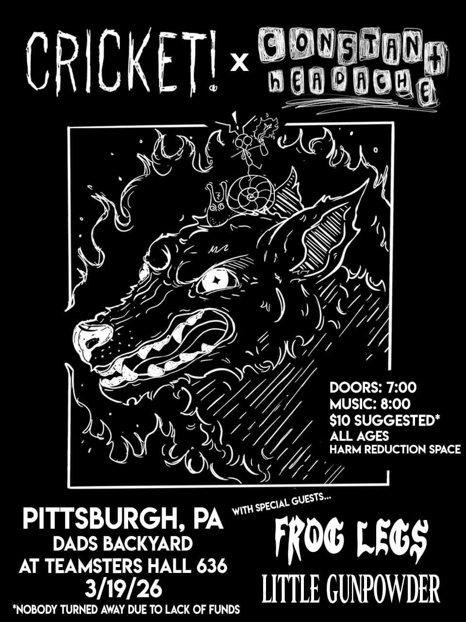 Touring acts Cricket and Constant Headache are coming thru on tour! We have local support from our very own Frog Legs and Little Gunpowder. We'll be running this outta the Teamsters Local 636 in Mckees Rocks so bring your dancing shoes. As always the venue will have hotdogs and seltzers. This is an all ages Harm Redux Space so we ask drinkers to cover cans and anything else you wanna do to happen off property if ya can. Thanks to Crisp Lake for helping with the venue!