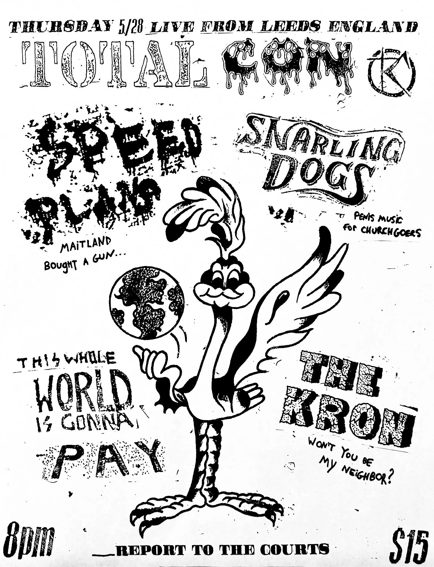 Total Con with Speed Plans, Snarling Dogs, The Kron Leeds UK anarcho-punk band Total Con headlines a punk show at the Courts with local Pittsburgh acts Speed Plans, Snarling Dogs, and The Kron. Concert Friday, May 29, 2026 at 8:00 PM The Courts All Ages Door: $15 Snarling Dogs Speed Plans The Courts Diy Hardcore Punk