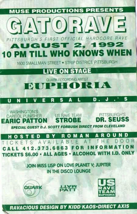 Muse Productions presents Gatorave: Pittsburgh’s first official 100% hardcore rave, held on August 2, 1992 at 1600 Smallman Street in the Strip District. The event featured a headlining live performance from Quark Recording Artist Euphoria. Also performing were Universal DJs: Earic Patton (Washington’s Capitol Punisher), Strobe (US Rave Team), and Pittsburgh’s own Dr. Seuss, with special guest DJ Scott Forbush from Cleveland. Hosted by Roman Around. In the disco lounge: Miss Lisp spinning on Love Planet V: Jupiter. Flyer design by Kidd Kaos and Direct Axis. Tickets were $6, all ages, with ID required for alcohol.