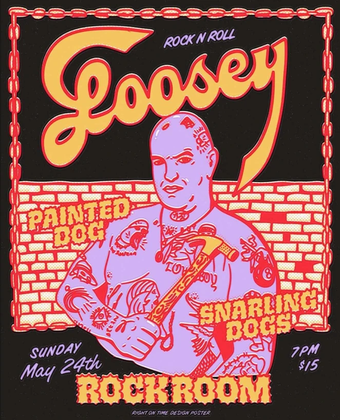A rock n roll show at the Rock Room in Pittsburgh, PA on Sunday, May 24th. Headlined by Loosey, with support from Painted Dog and Snarling Dogs. Doors at 7PM, tickets $15. Poster design by Right On Time Design. Loosey is a NYC band known for their Oi!/Skinhead/Street Rock ‘n’ Roll flavor