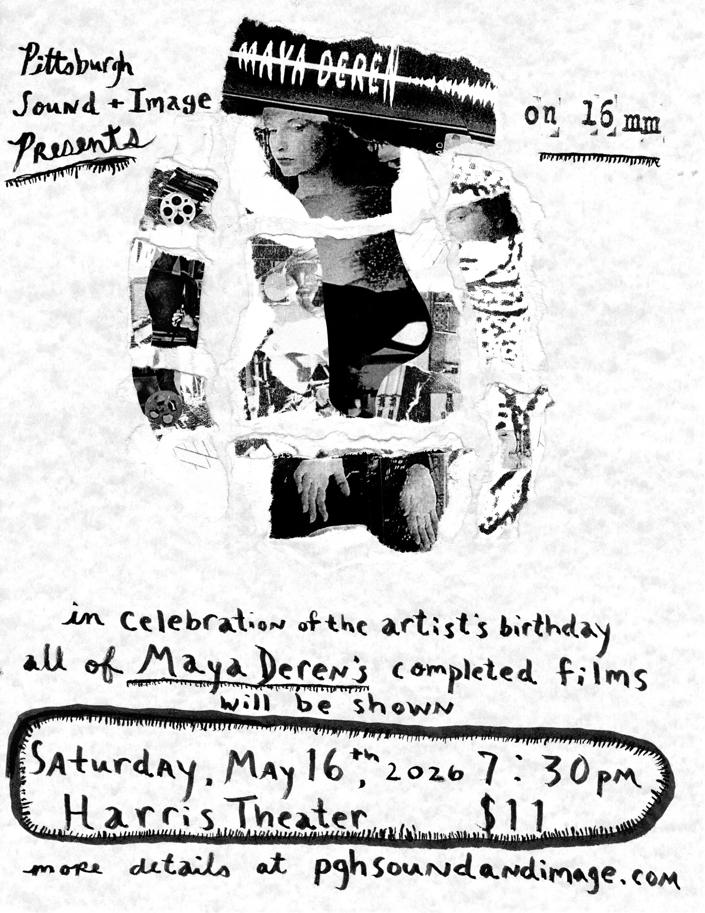 Pittsburgh Sound + Image presents a special screening of all of Maya Deren's completed films on 16mm film, in celebration of the pioneering avant-garde filmmaker's birthday. Maya Deren (born May 29, 1917) is widely regarded as one of the most important experimental filmmakers of the 20th century, known for works such as 'Meshes of the Afternoon' (1943), 'At Land' (1944), 'A Study in Choreography for Camera' (1945), 'Ritual in Transfigured Time' (1946), 'Meditation on Violence' (1948), and 'The Very Eye of Night' (1958). This rare opportunity to see her complete works projected on original 16mm format is not to be missed. Tickets are $11. More details at pghsoundandimage.com.