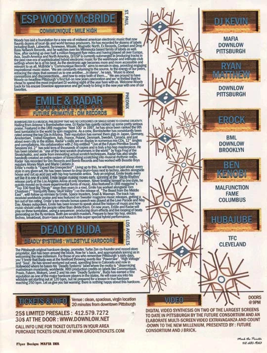 Hosted 20 minutes outside Pittsburgh at a large venue with digital video synthesis by Future Consortium and Aunt Buck. Organized by Downlow and Future Consortium.