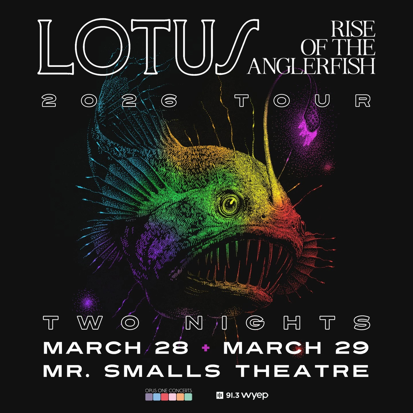 Lotus – Rise of the Anglerfish Tour (Two Nights) Lotus brings the Rise of the Anglerfish Tour to Mr. Smalls for two nights. Concert Saturday, March 28, 2026 at 8:00 PM - 11:00 PM Mr. Smalls All Ages Mr. Smalls Electronic Funk Jam