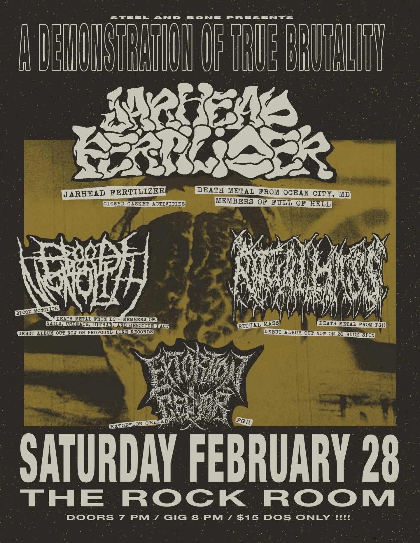 A Demonstration of True Brutality featuring Jarhead Fertilizer Jarhead Fertilizer with Blood Monolith, Ritual Mass, and Extortion Cellar at The Rock Room. Concert Saturday, February 28, 2026 at 8:00 PM - 11:30 PM Rock Room 21+ $15 Ritual Mass Rock Room Death Metal Metal