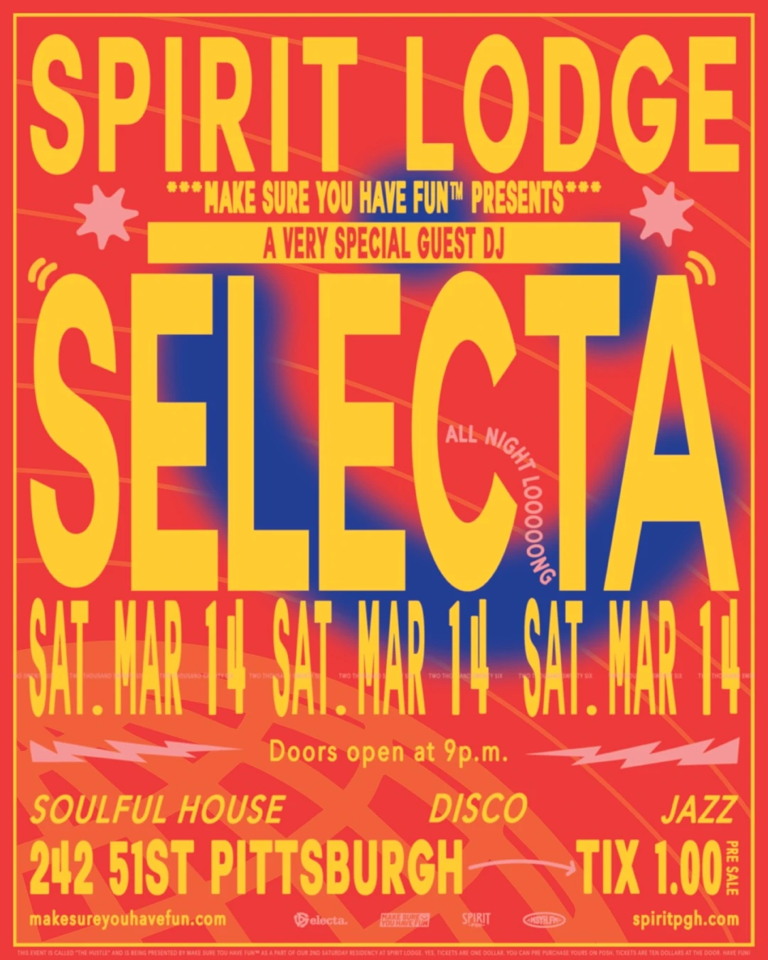 The Hustle: Soulful House, Disco and Jazz Party with Selecta The Hustle dance party ft. Selecta at Spirit Club Night Saturday, March 14, 2026 at 9:00 PM Spirit 21+ Presale: $1 Door: $10 Spirit Selecta Deep House Jazz Soul Disco