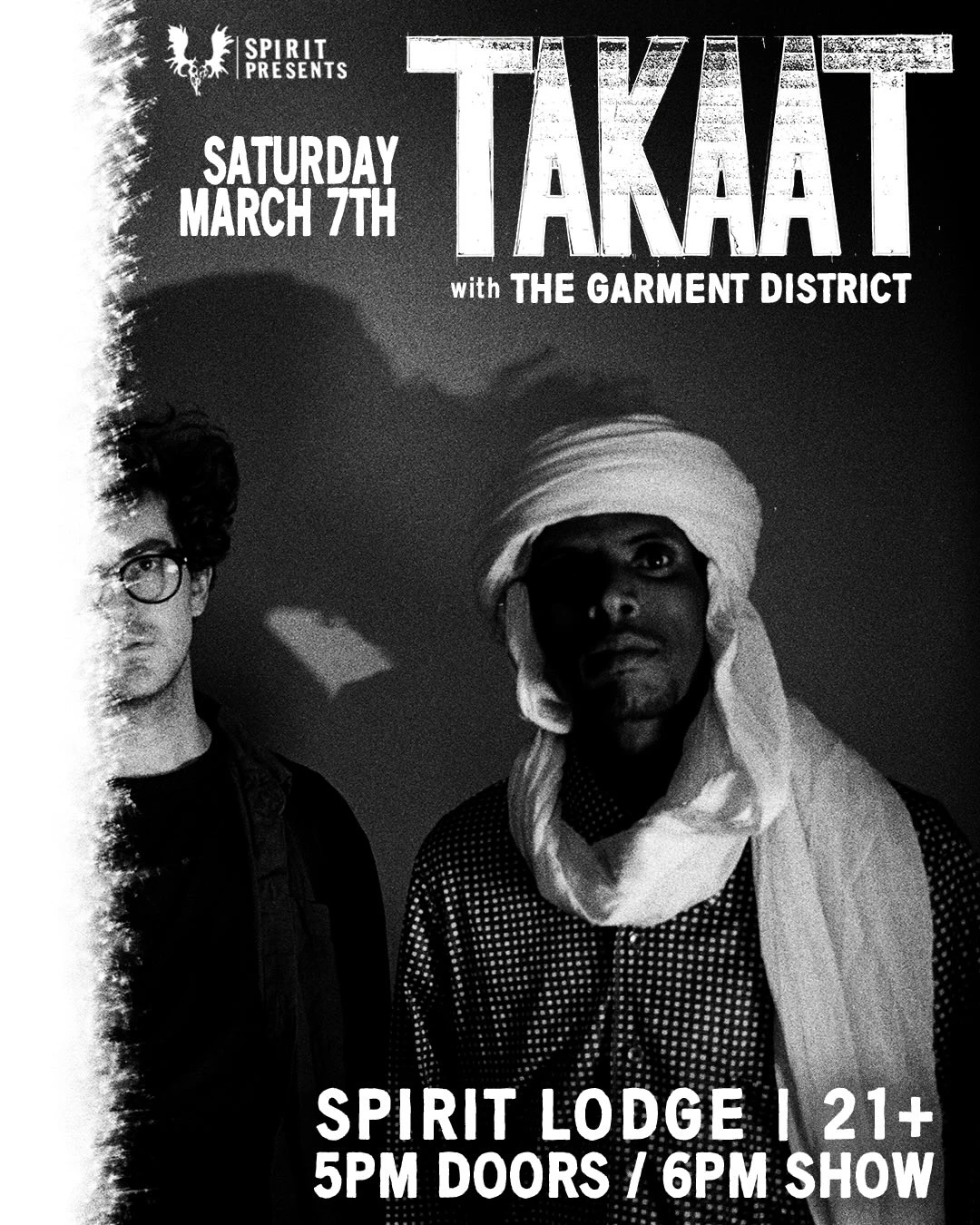 TAKAAT TAKAAT live at Spirit Lodge – early show. Concert Saturday, March 7, 2026 at 6:00 PM Spirit All Ages Spirit The Garment District Psychedelic Punk World Music