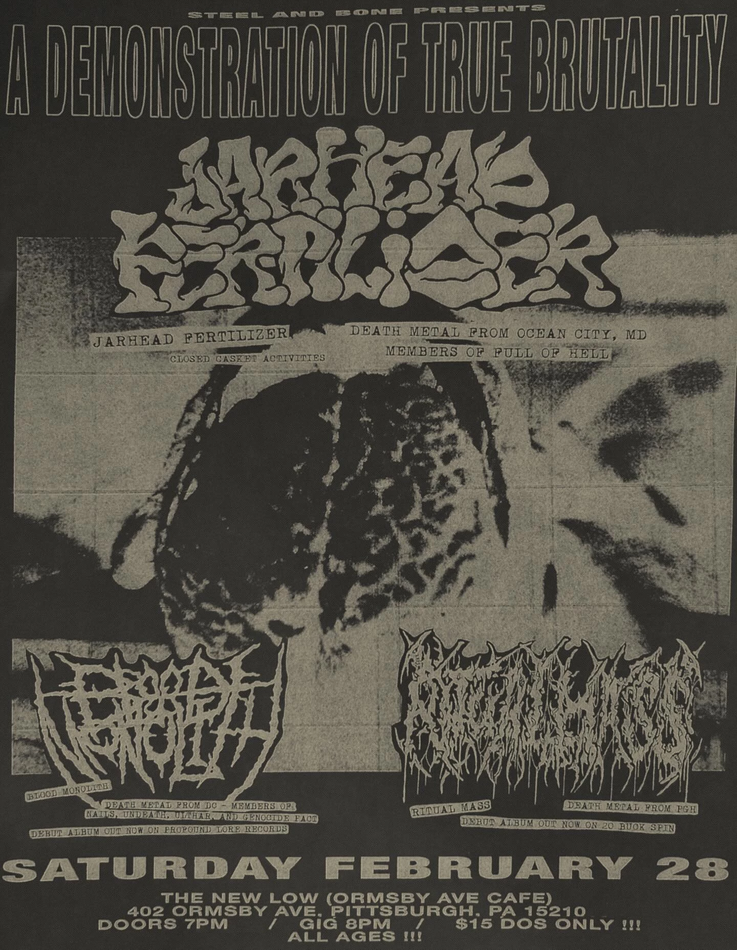 Jarhead Fertilizer, Flesher, and Ritual Mass bring the brutality to The New Low. All ages.