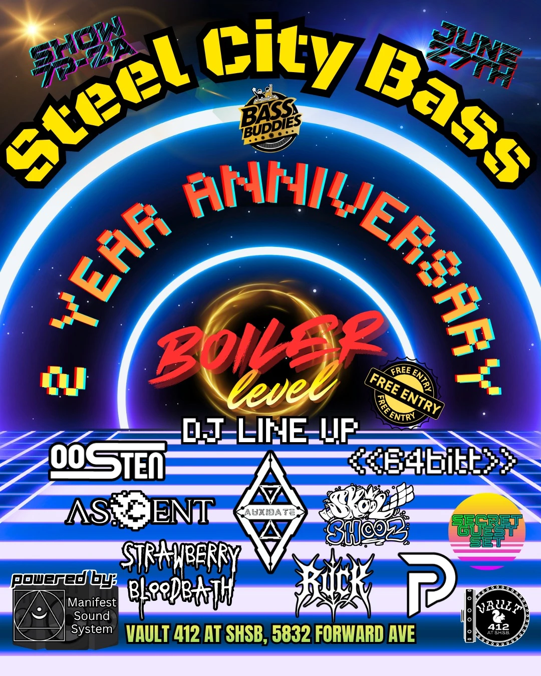 Steel City Bass presents their 2 Year Anniversary party at Vault 412 at SHSB, 5832 Forward Ave, Pittsburgh, PA. Hosted by Bass Buddies and powered by Manifest Sound System, this free entry bass music extravaganza features a stacked DJ lineup including 00Sten, B4Bitt, Ascent, Auxidate, Skool Shooz, Strawberry Bloodbath, Ruck, and a Secret Guest Set. The show runs 7PM–2AM on June 27th, 2025. Free entry — come out and celebrate two years of Steel City Bass music culture in Pittsburgh.