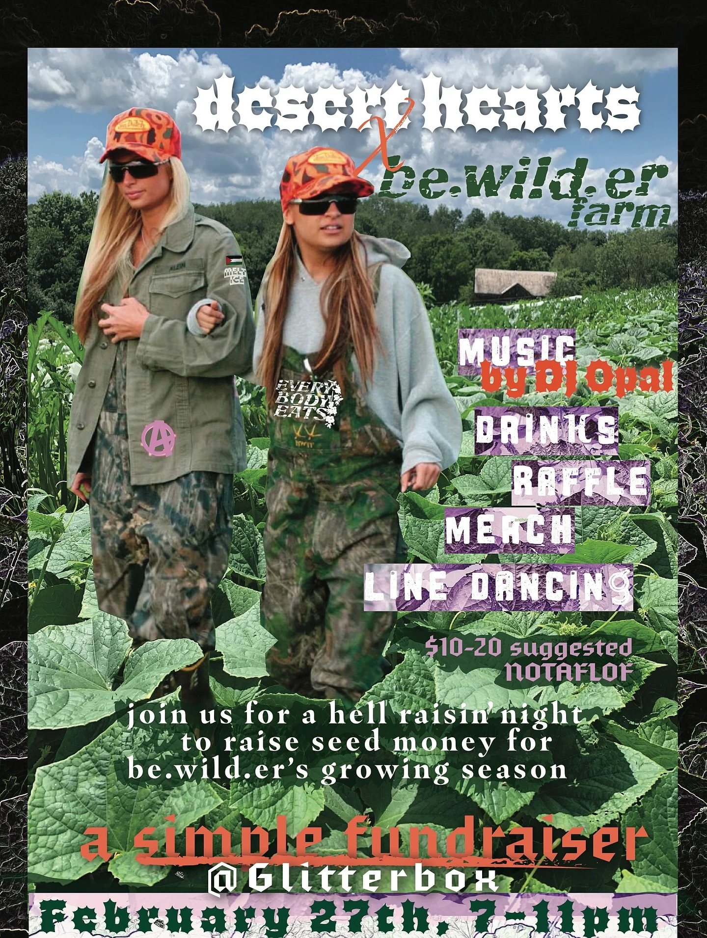 Desert Hearts x be.wild.er Fundraiser Fundraiser party with Desert Hearts and be.wild.er featuring DJ Opal. Pop-up Friday, February 27, 2026 at 7:00 PM - 11:00 PM Glitter Box Theater (Homestead) All Ages Glitter Box Theater (Homestead) Country