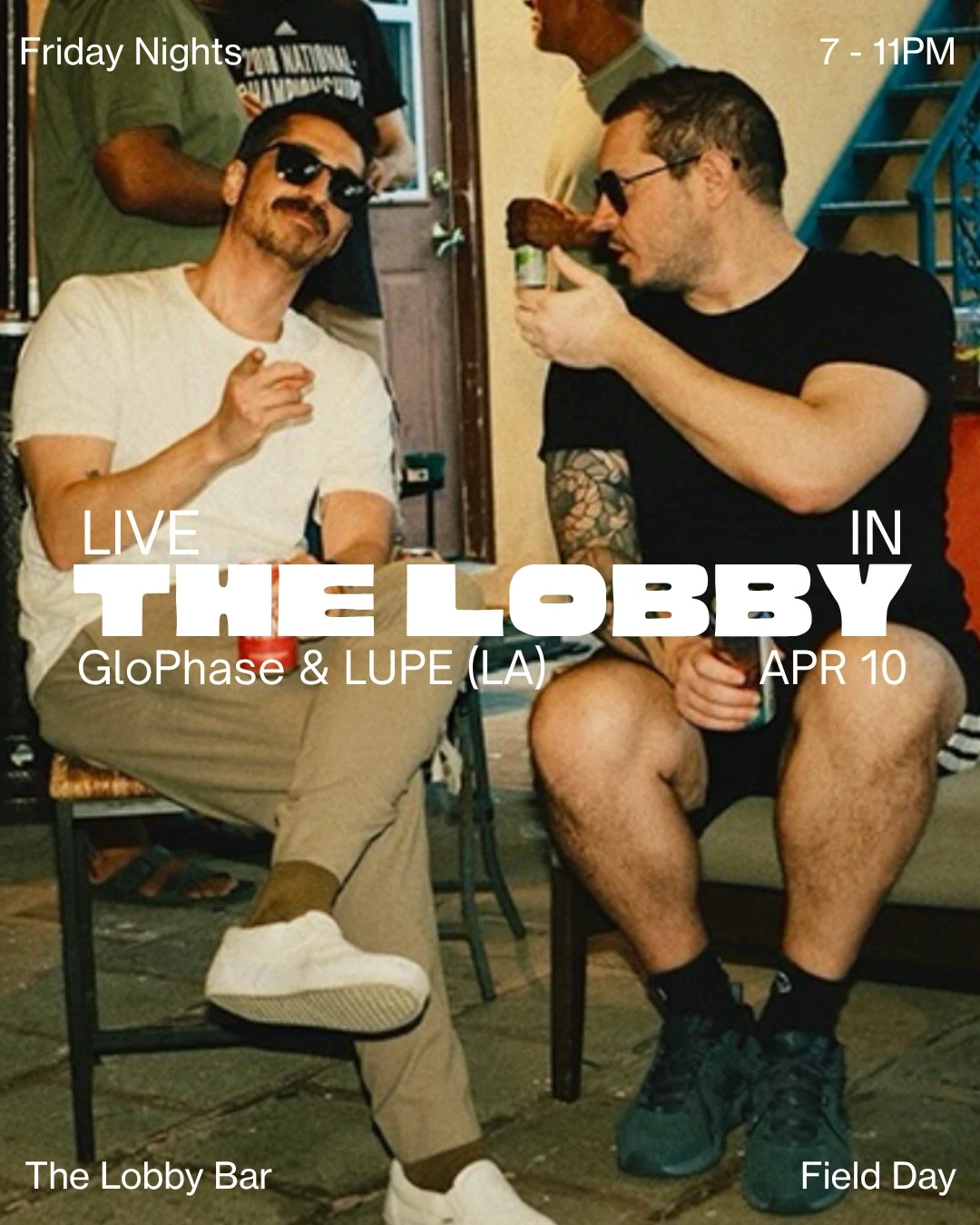 Live in The Lobby: GloPhase & LUPE (LA) GloPhase and LUPE (LA) bring their DJ sets to The Lobby Bar for a Friday night session. Club Night Thursday, April 10, 2025 at 7:00 PM - 11:00 PM Field Day 21+ Field Day Glo Phase Deep House Downtempo Electronic