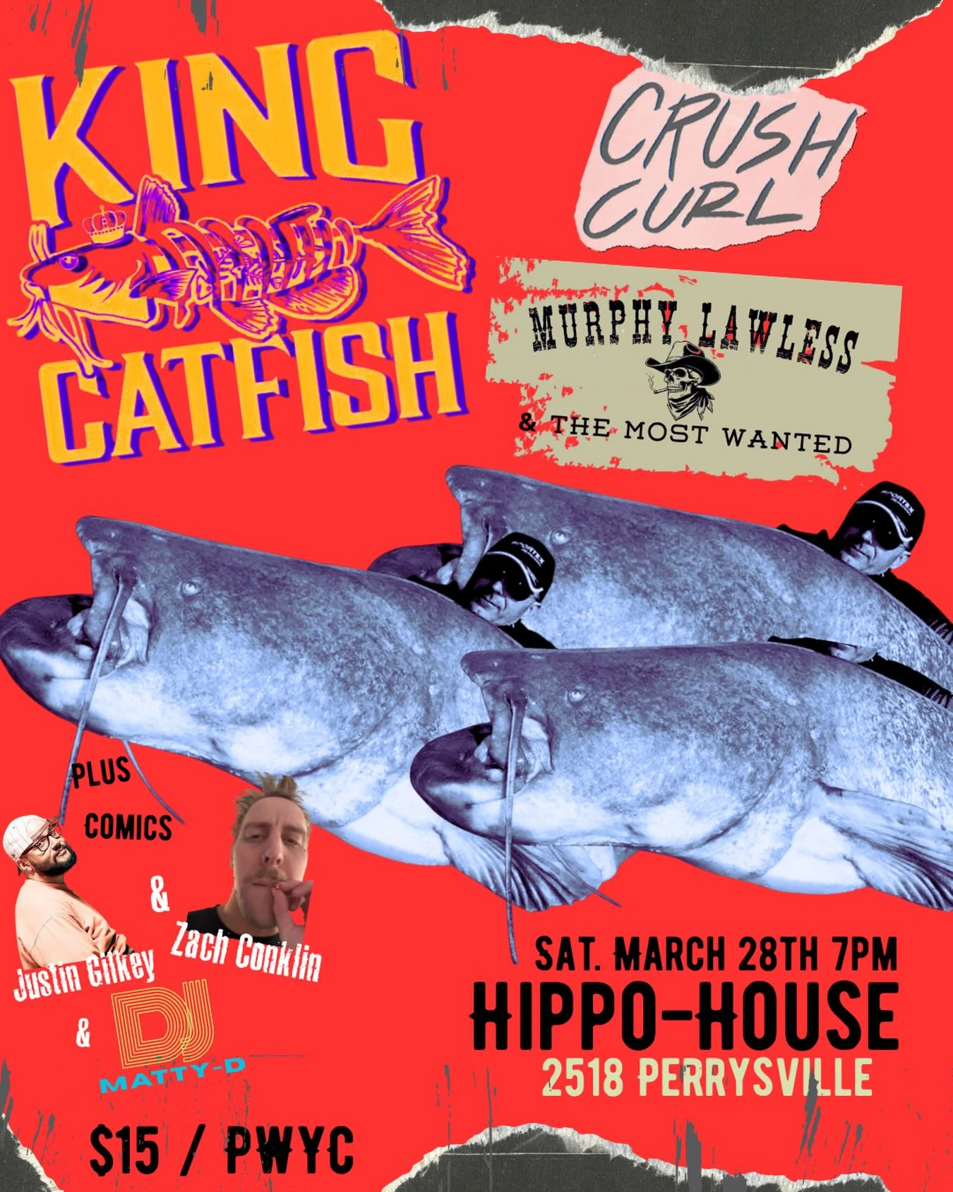 King Catfish with Crush Curl and Murphy Lawless & The Most Wanted Live music and comedy at Hippo-House Concert Saturday, March 28, 2026 at 7:00 PM - 11:00 PM Hippo House All Ages Presale: $15 Door: $15 Hippo-House King Catfish Comedy Indie