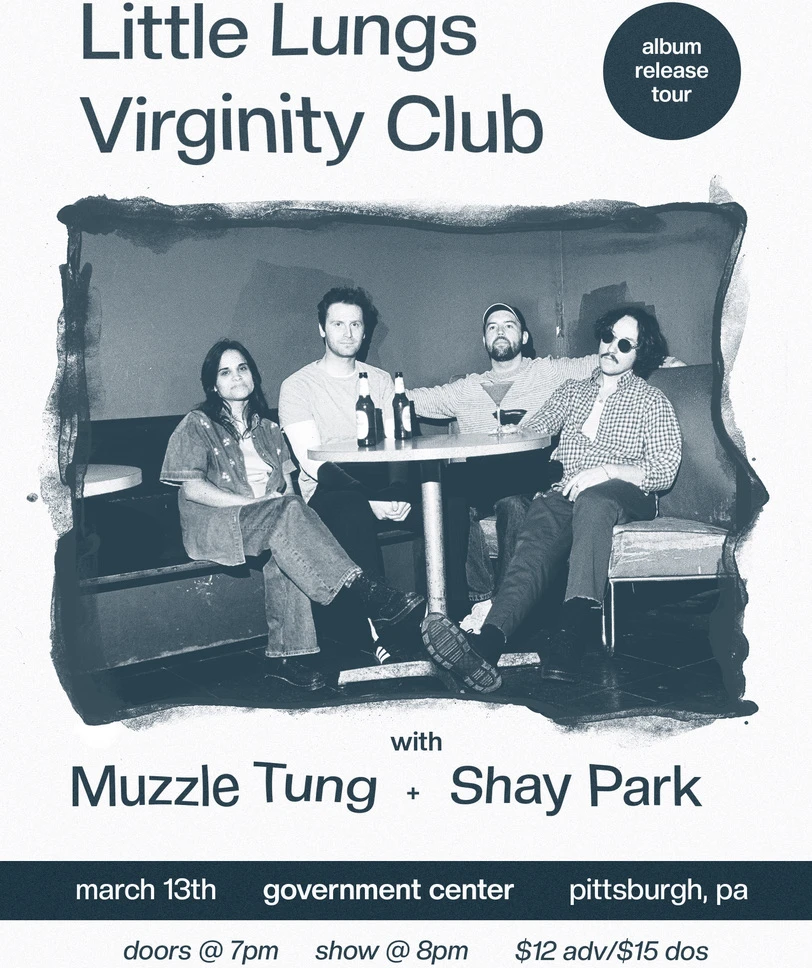 Little Lungs / Virginity Club (Album Release Tour) with Muzzle Tung + Shay Park Little Lungs & Virginity Club album release tour stop in Pittsburgh with Muzzle Tung and Shay Park. Concert Saturday, March 14, 2026 at 12:00 AM The Government Center Presale: $12 Door: $15 The Government Center Indiepop Alternative