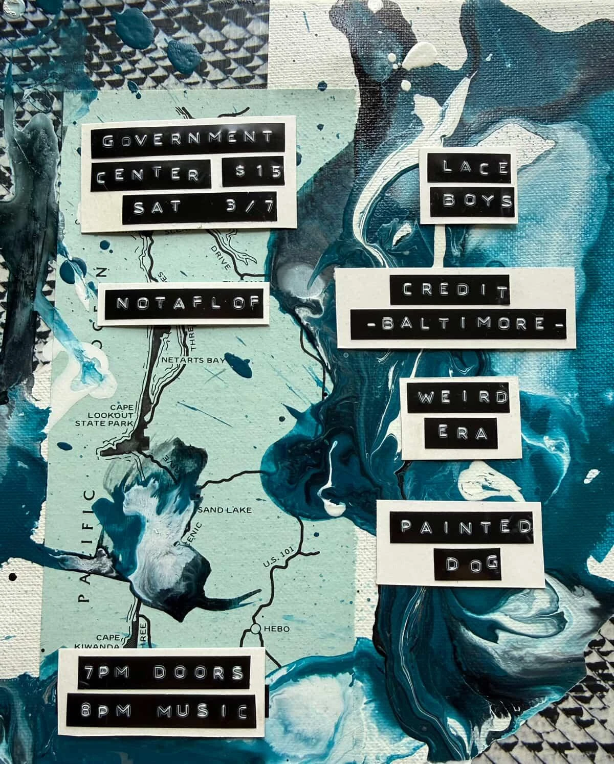 Credit with Lace Boys, Weird Era and Painted Dog Credit (Baltimore) with Lace Boys, Weird Era and Painted Dog at The Government Center. Concert Saturday, March 7, 2026 at 8:00 PM The Government Center All Ages The Government Center Lace Boys Weird Era +1 more Indie Noise Rock Punk Rockabilly