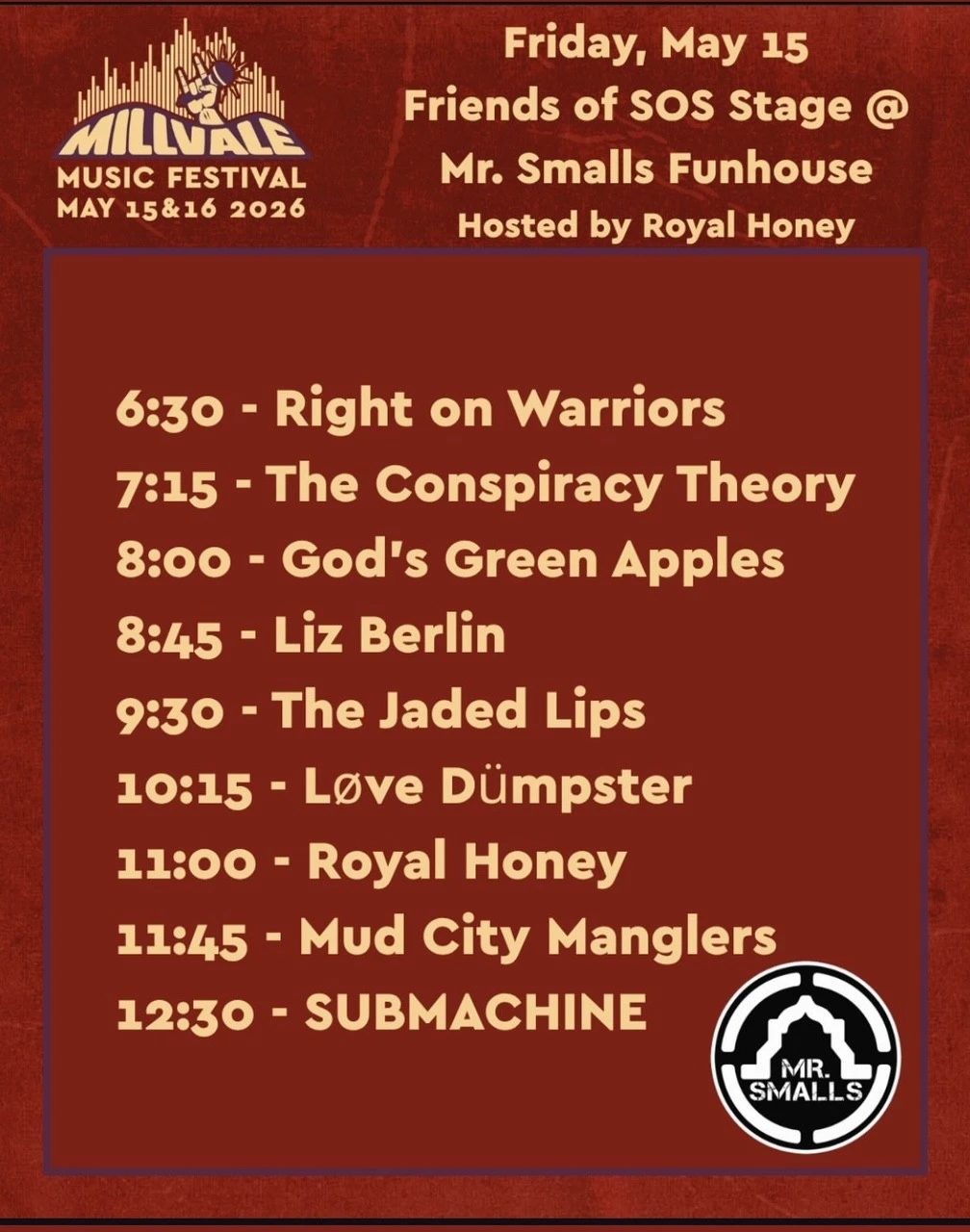 Millvale Music Festival 2026 – Friends of SOS Stage The Friends of SOS Stage at Mr. Smalls Funhouse hosted by Royal Honey Festival Friday, May 15, 2026 at 6:00 PM - 1:30 AM The Funhouse at Mr. Smalls All Ages Mud City manglers Submachine The Funhouse at Mr. Smalls Alternative Indie Indierock Live Music Punk +1 more