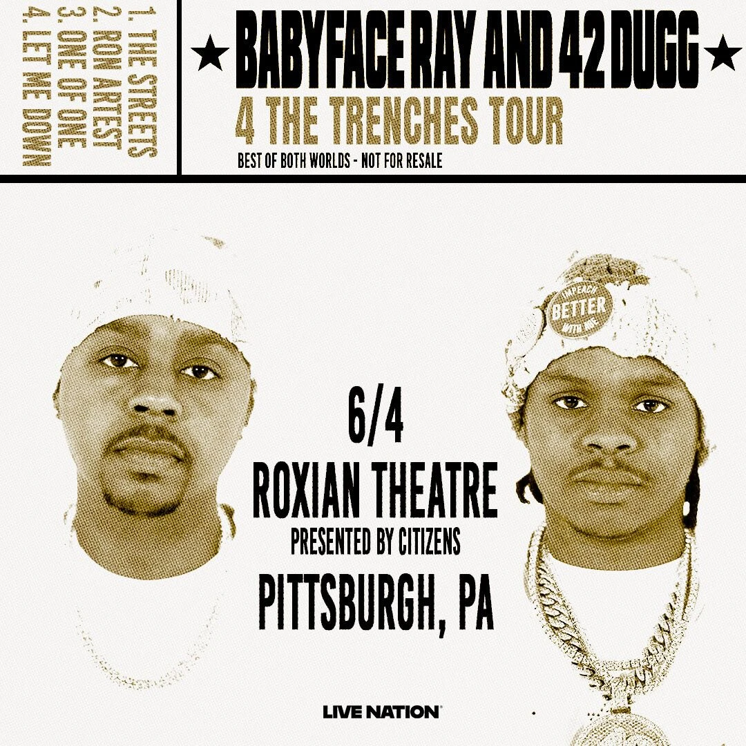 Babyface Ray and 42 Dugg: 4 The Trenches Tour Babyface Ray and 42 Dugg bring their '4 The Trenches Tour' to Roxian Theatre in Pittsburgh, PA on June 4th. Concert Thursday, June 4, 2026 at 8:00 PM Roxian Theater 18+ Roxian Theater Rap Trap