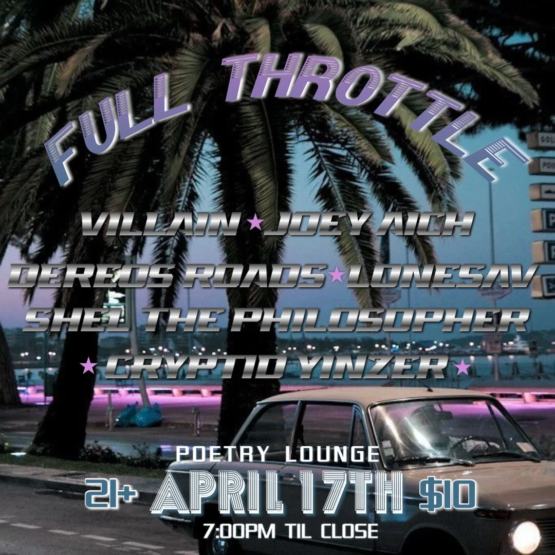 Full Throttle A hip-hop showcase featuring Villain, Joey Aich, Dereos Roads, Lonesav, Shel The Philosopher, and Cryptid Yinzer at Poetry Lounge. Concert Friday, April 17, 2026 at 7:00 PM Poetry Lounge 21+ Door: $10 Cryptid Yinzer Poetry Lounge Hip Hop House Rap Techno