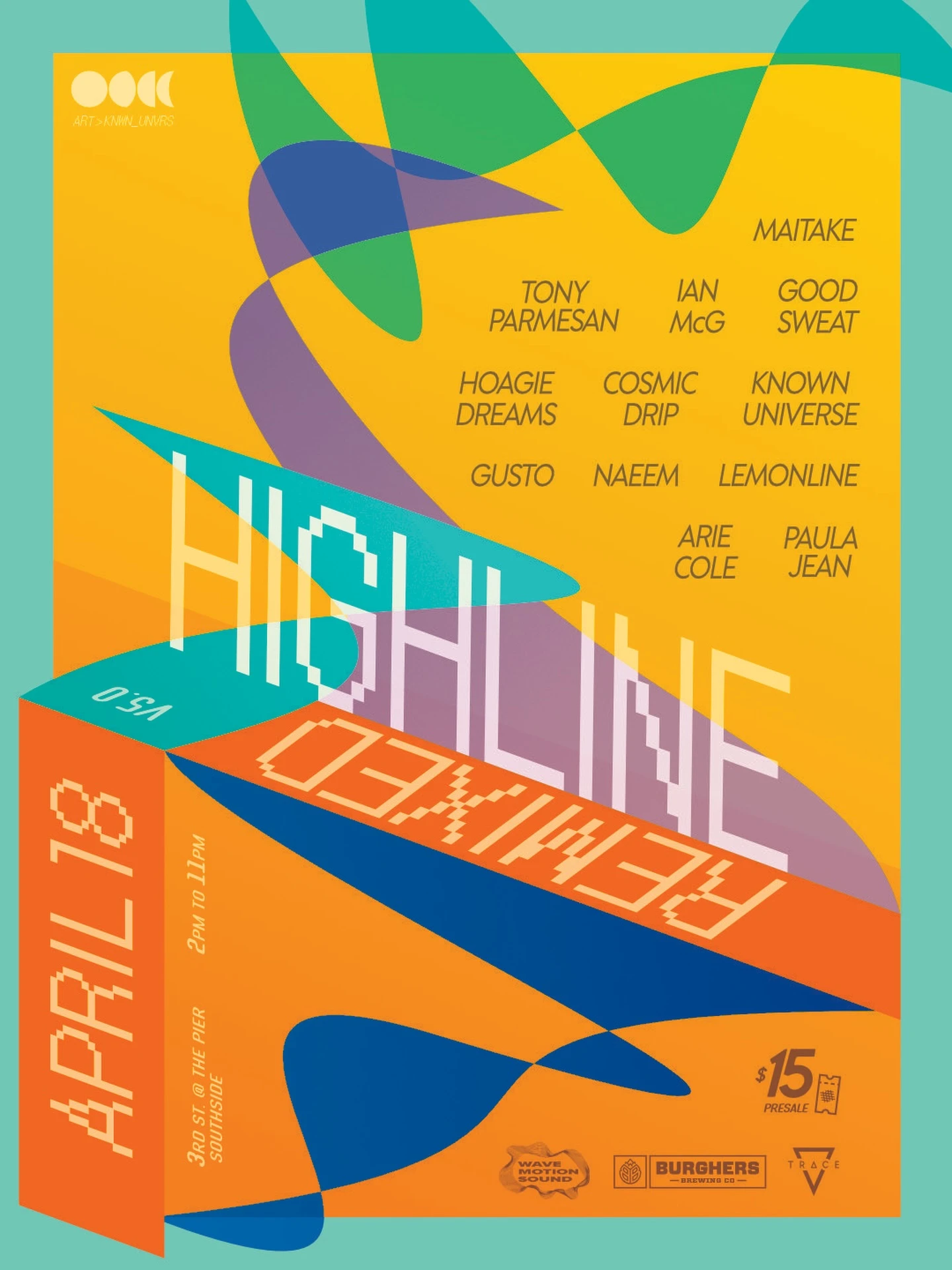Highline Remix Outdoor DJ showcase with 12 local DJs at the Highline. Pop-up Saturday, April 18, 2026 at 2:00 PM - 11:00 PM Highline All Ages Arie Cole Buku Cosmic Drip +5 more Bass Electronic House Techno