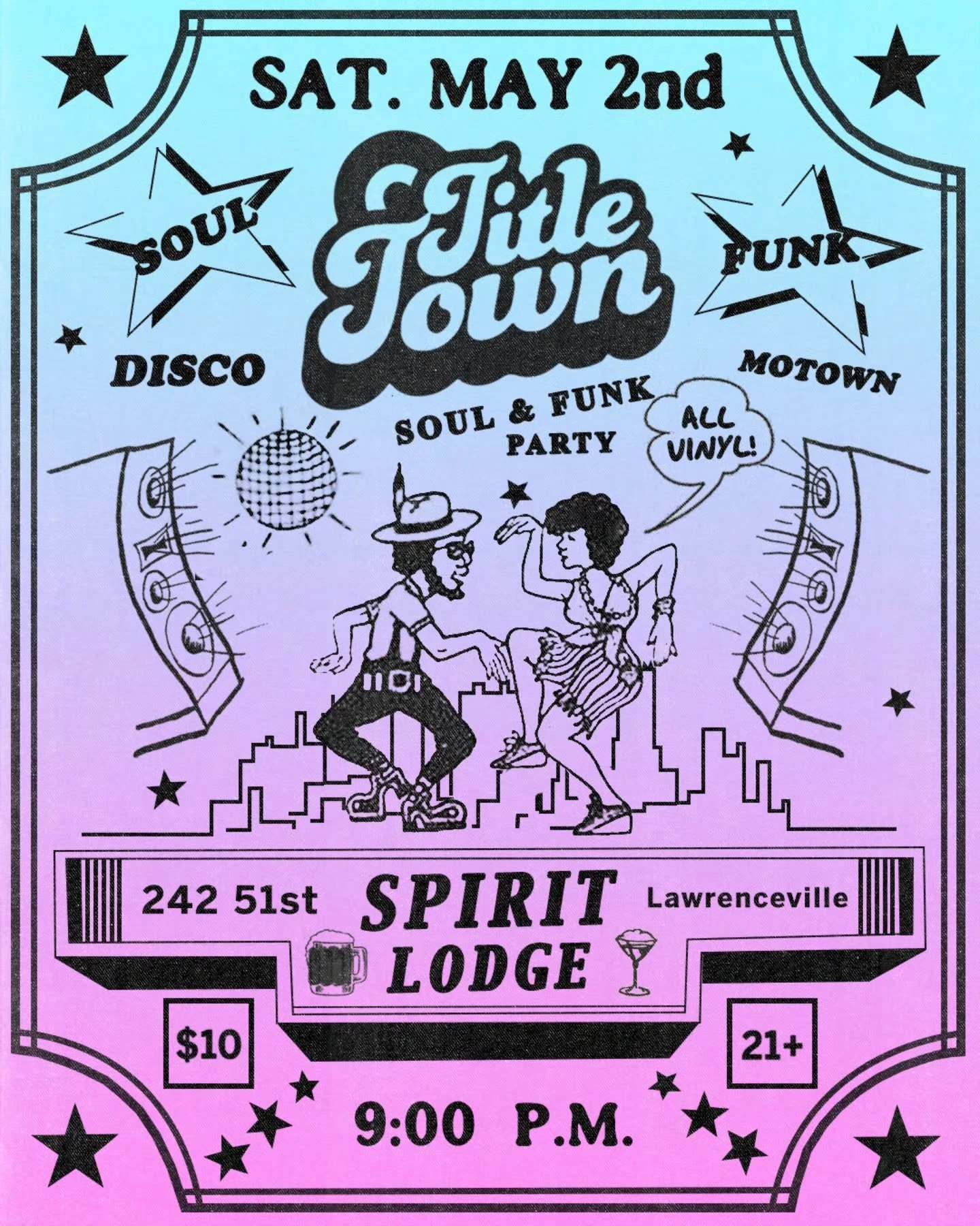 Title Town is an all-vinyl Soul & Funk Party coming to Spirit Lodge in Pittsburgh's Lawrenceville neighborhood on Saturday, May 2nd. Expect a night of classic grooves spanning Soul, Funk, Disco, and Motown — all played from vinyl records. The event kicks off at 9:00 PM, is 21+ only, and admission is $10 at the door. Spirit Lodge is located at 242 51st Street, Lawrenceville, Pittsburgh, PA.