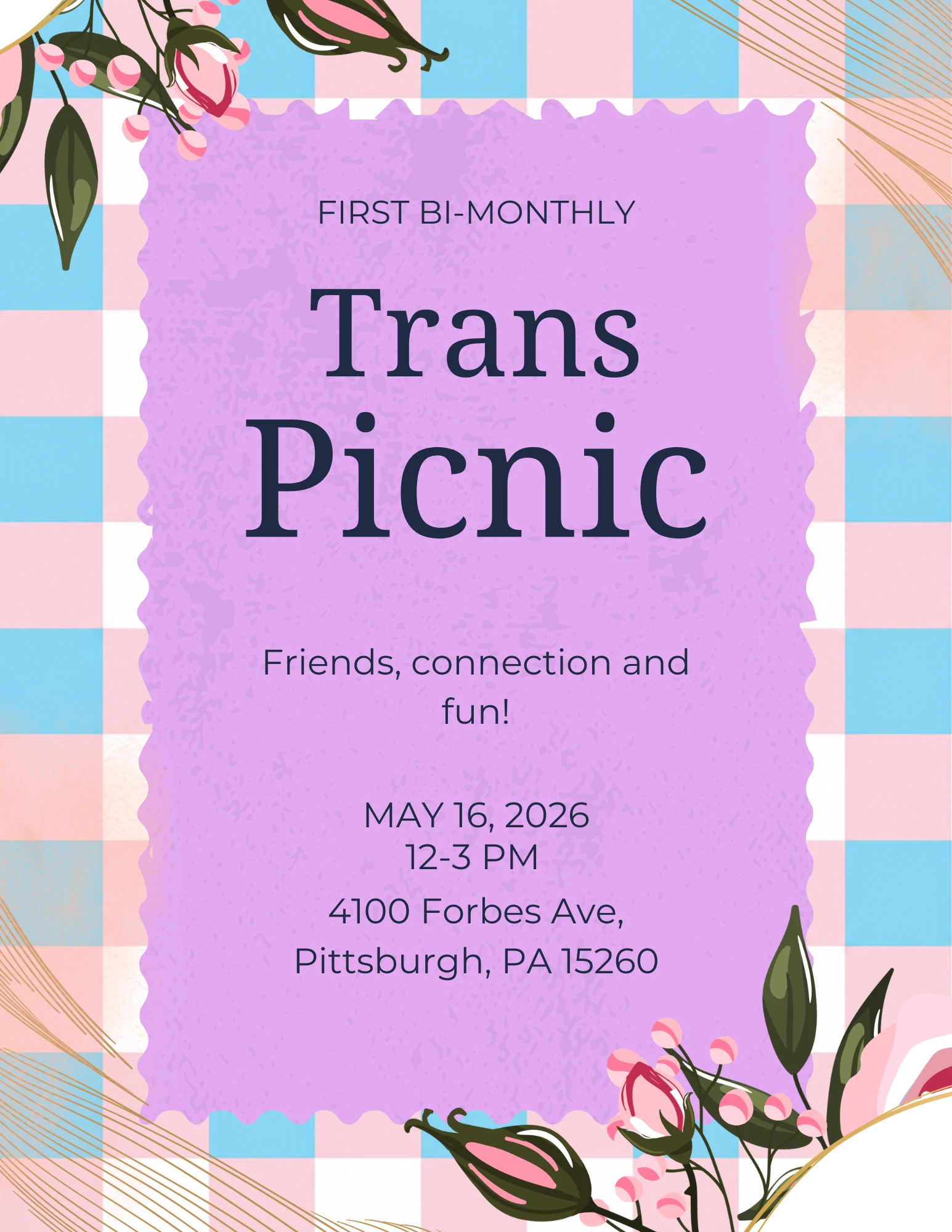 Come and meet other trans people! Build community, eat free snacks/drinks, bring food for yourself or to share with others! Anyone trans, non-binary or who feels they belong in a trans space is welcome. Let's enjoy the weather together!