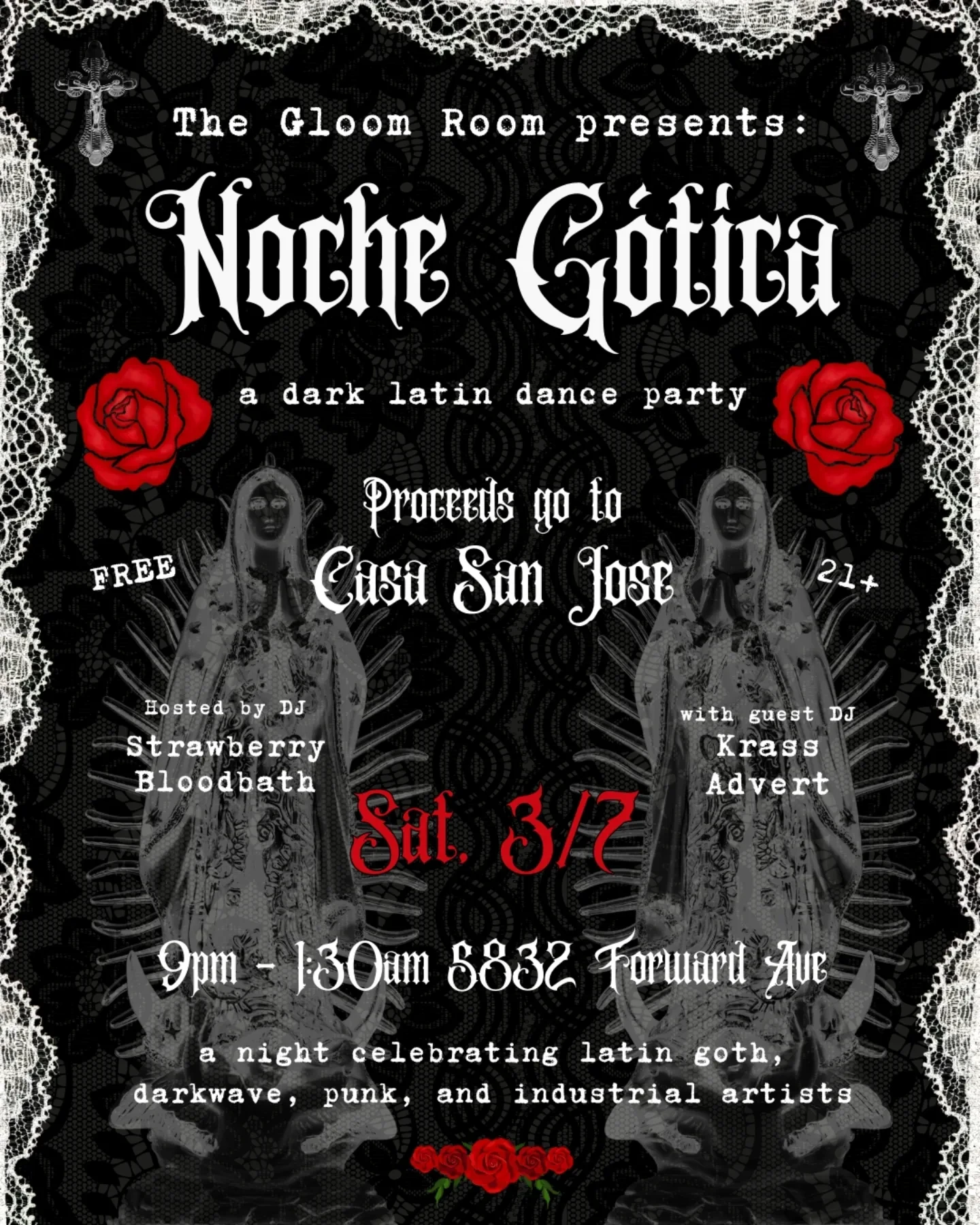 Noche Gótica: A Dark Latin Dance Party Dark Latin goth and industrial dance night benefiting Casa San Jose. Club Night Saturday, March 7, 2026 at 9:00 PM - 1:30 AM Squirrel Hill Sports Bar 21+ Krass Advert Squirrel Hill Sports Bar Strawberry Bloodbath Goth Industrial Latin Post-punk