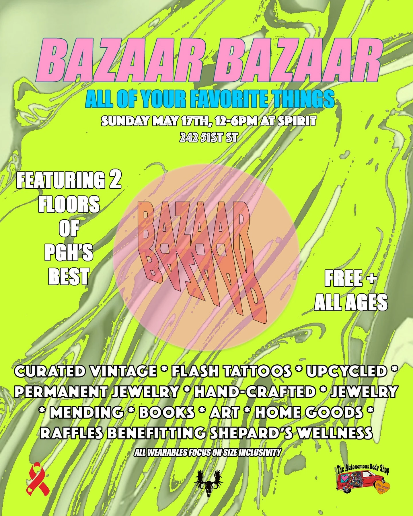 Bazaar Bazaar: All Of Your Favorite Things Two-floor curated bazaar at Spirit featuring vintage, art, and more. Pop-up Sunday, May 17, 2026 at 12:00 PM - 6:00 PM Spirit All Ages Spirit Market