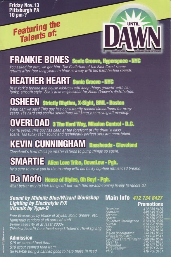 Sound by Midnite Blue/Wizard Workshop, lighting by Electrolyte F/X, visuals by Type-0. The event featured giveaways, vendors, a large venue (capacity 2000+), and a food drive donation for local soup kitchens.