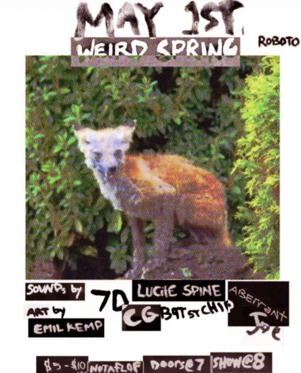 Weird Spring is a multi-act music and art event taking place on May 1st at Roboto in Pittsburgh, PA. The night features sounds by 7D, Lucie Spine, CG, Bat St Chip, and Aberrant Joe, with visual art by Emil Kemp. Doors open at 7pm, show starts at 8pm. Admission is $5–$10 sliding scale, NOTAFLOF (No One Turned Away For Lack Of Funds). Roboto is Pittsburgh's beloved DIY arts and music venue located in the Bloomfield neighborhood.