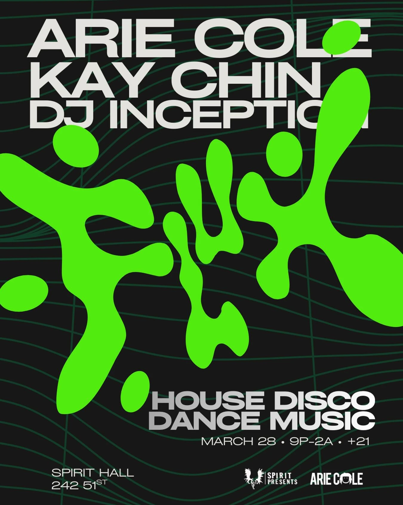 House and disco dance night with Arie Cole, Kay Chin, and DJ Inception.