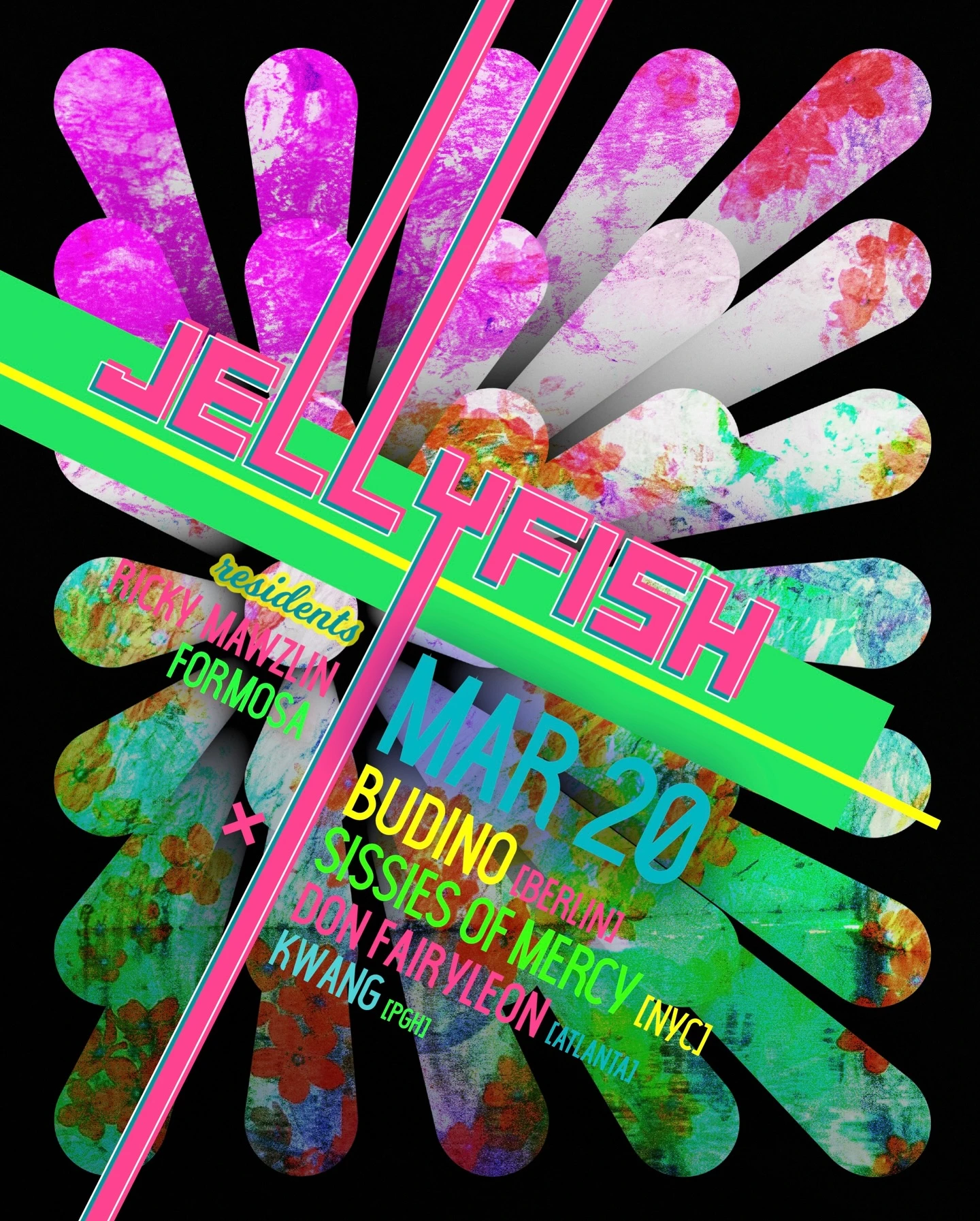 Two floors of queer forward electronic dance with Budino, Sissies of Mercy, Don Fairyleon, and Kwang.