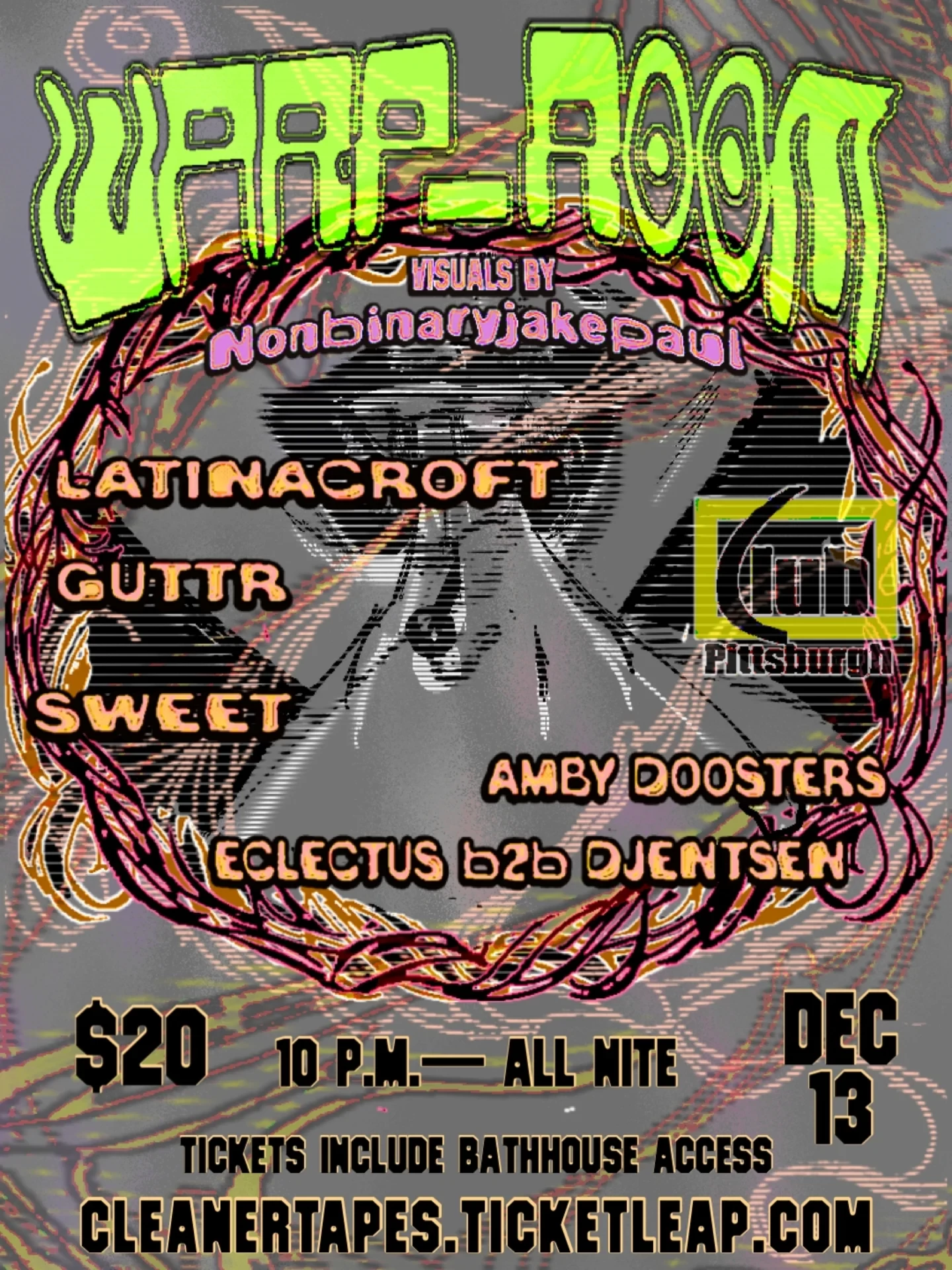 Electronic night featuring LatinaCroft, GUTTR, Sweet, and more at Club Pittsburgh. Art Opening at Club Pittsburgh 18+ $20 / $20Club Pittsburgh Cleaner Tapes Electronic Bass Experimental Idm Techno Acid Digital Hardcore