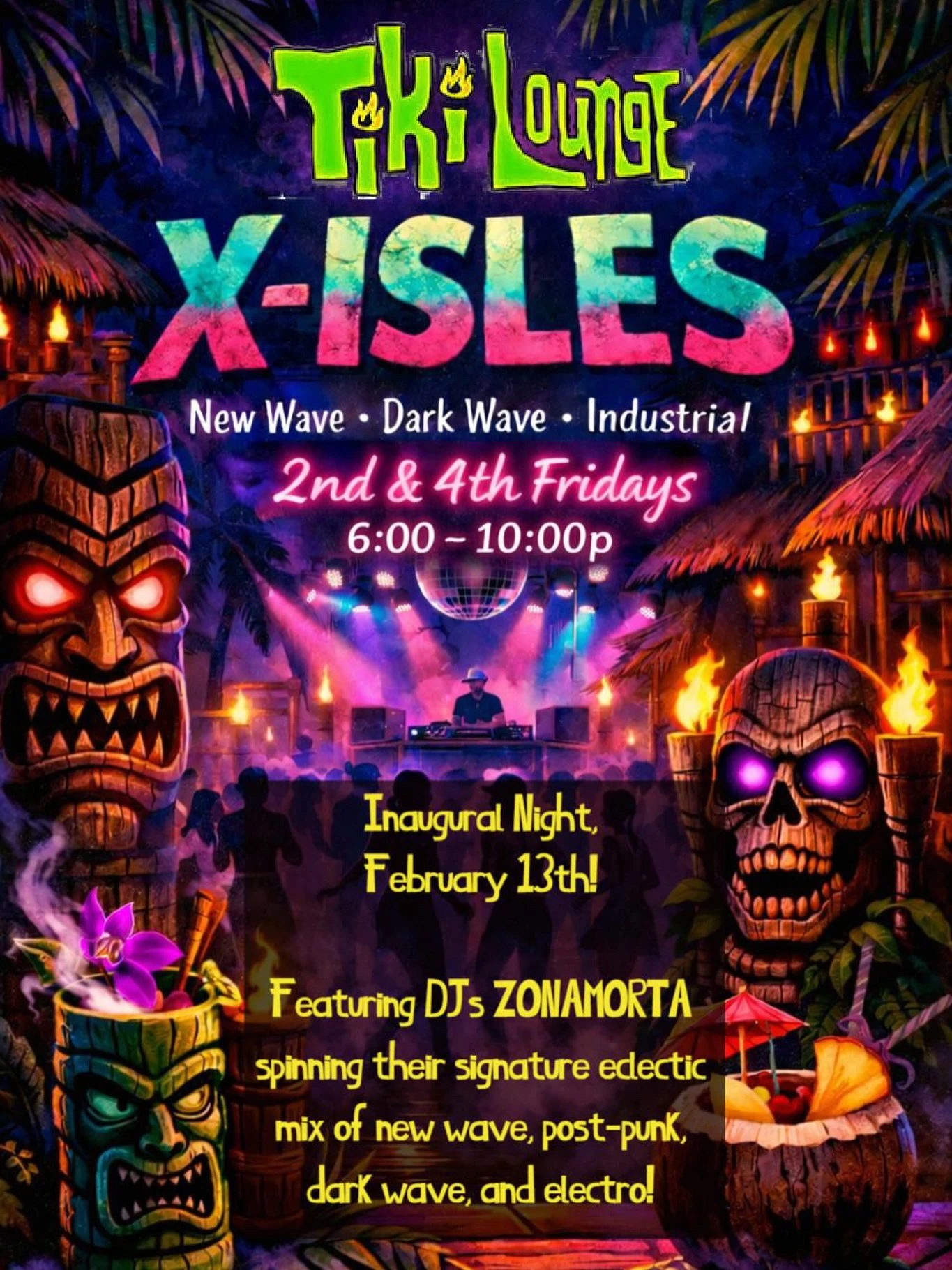 New wave, dark wave, and industrial night with DJ ZONAMORTA at Tiki Lounge.