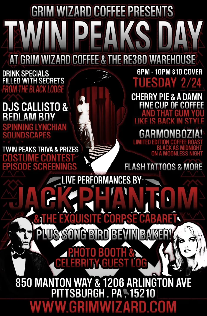 Twin Peaks-themed celebration with DJs, performances, trivia, and coffee at Grim Wizard & RE360. Pop-up at Grim Wizard Coffee All Ages $10Grim Wizard Coffee RE360 Warehouse Jack Phantom Lynchian Film Dark