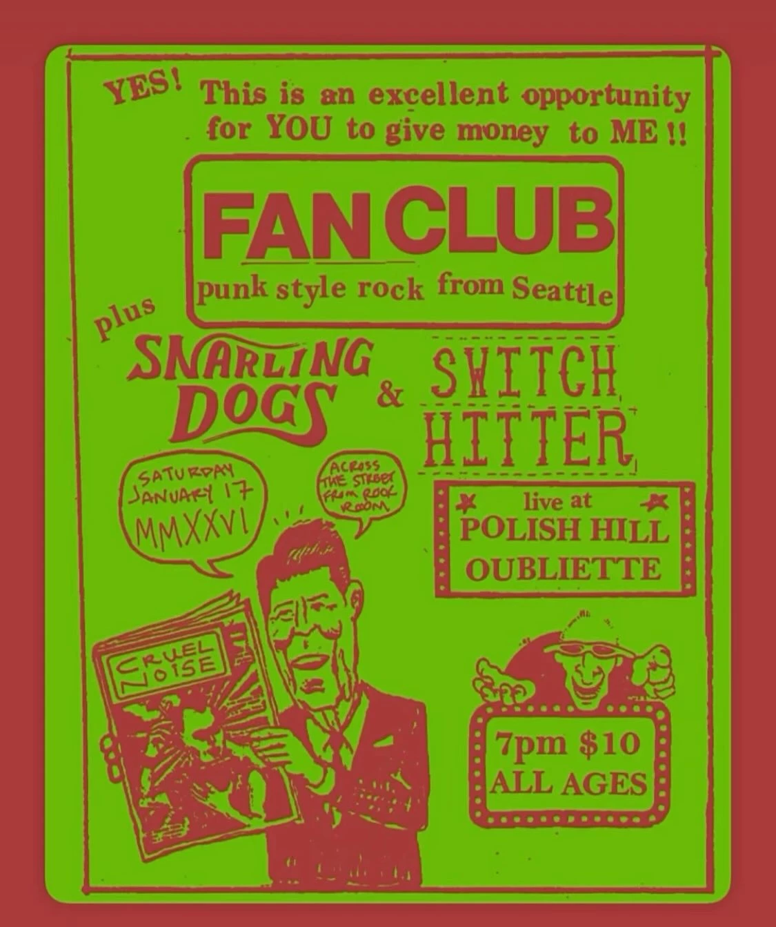 Punk style rock from Seattle with Fan Club, Snarling Dogs, and Switch Hitter at Polish Hill Oubliette. Art Opening at Polish Hell Oubliette All Ages $10